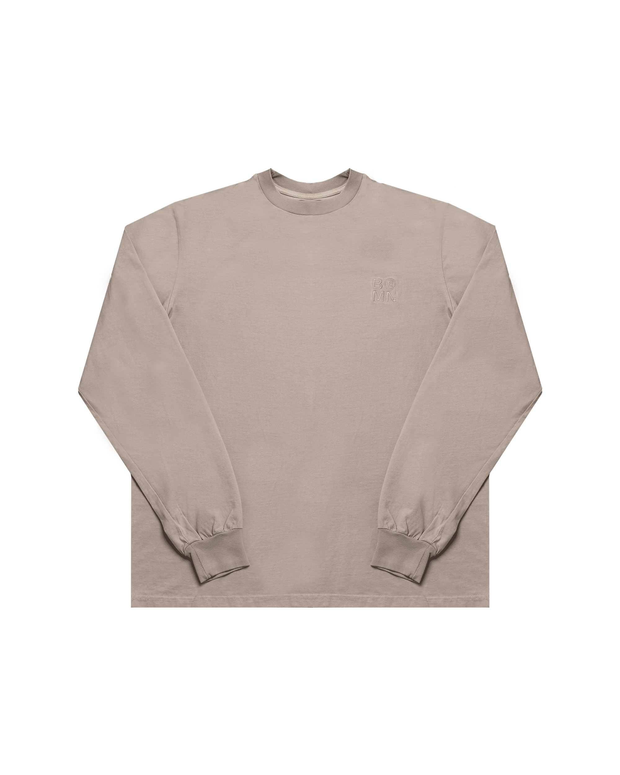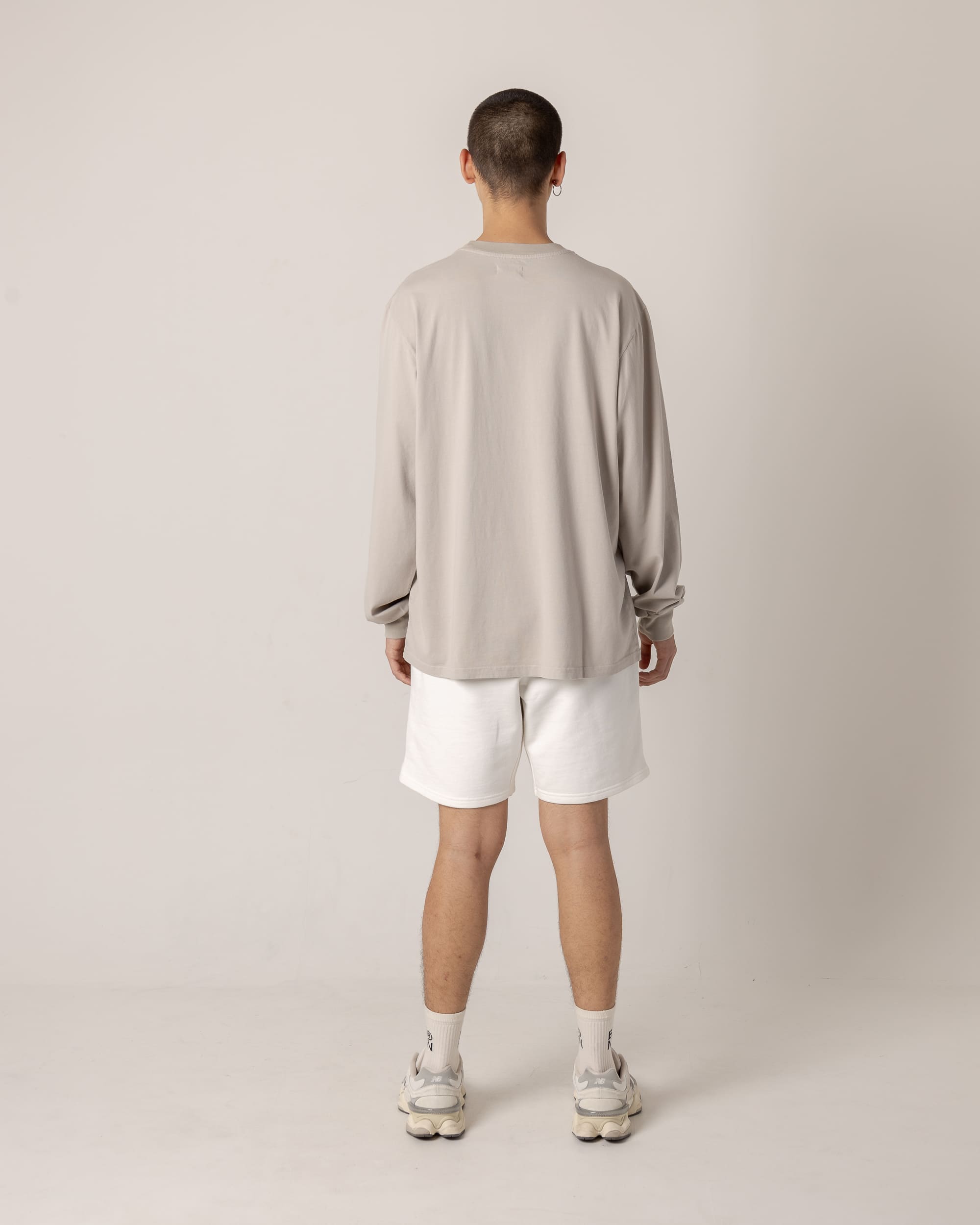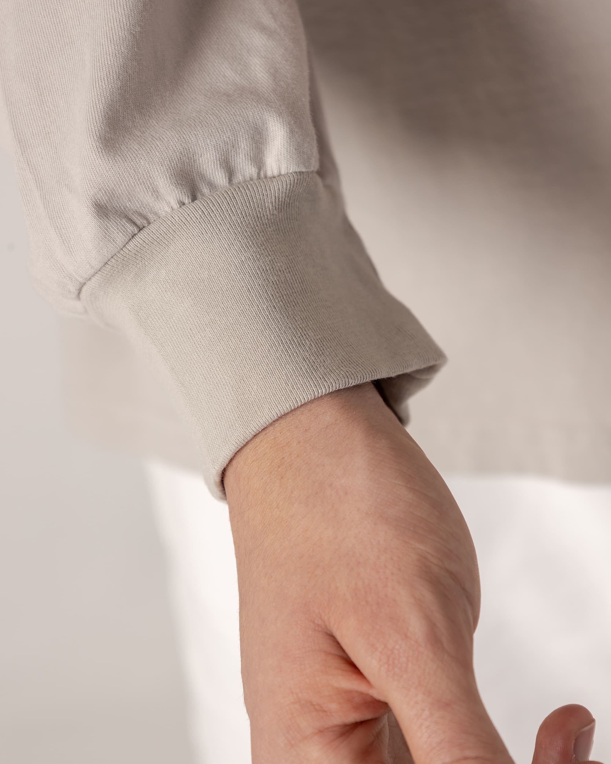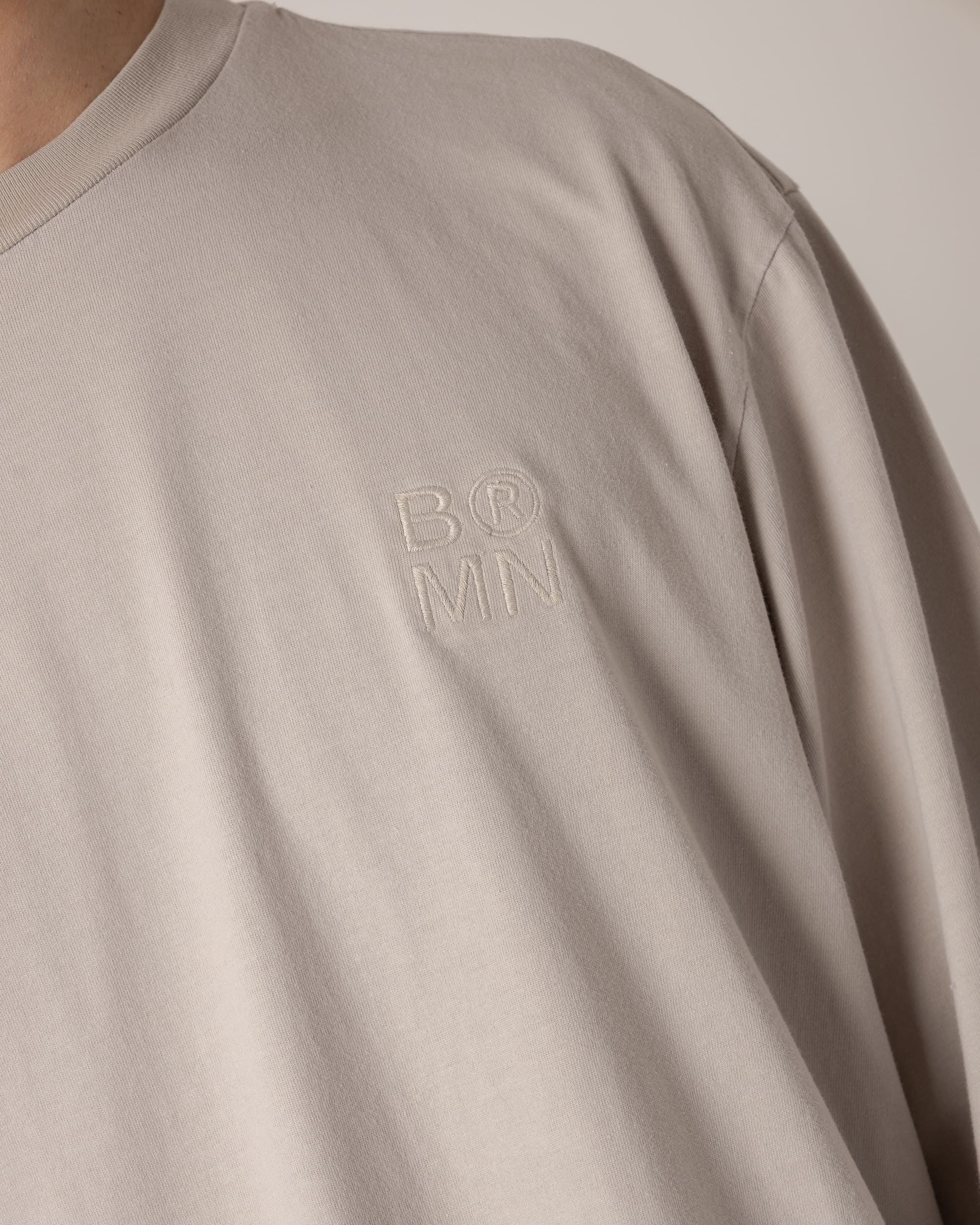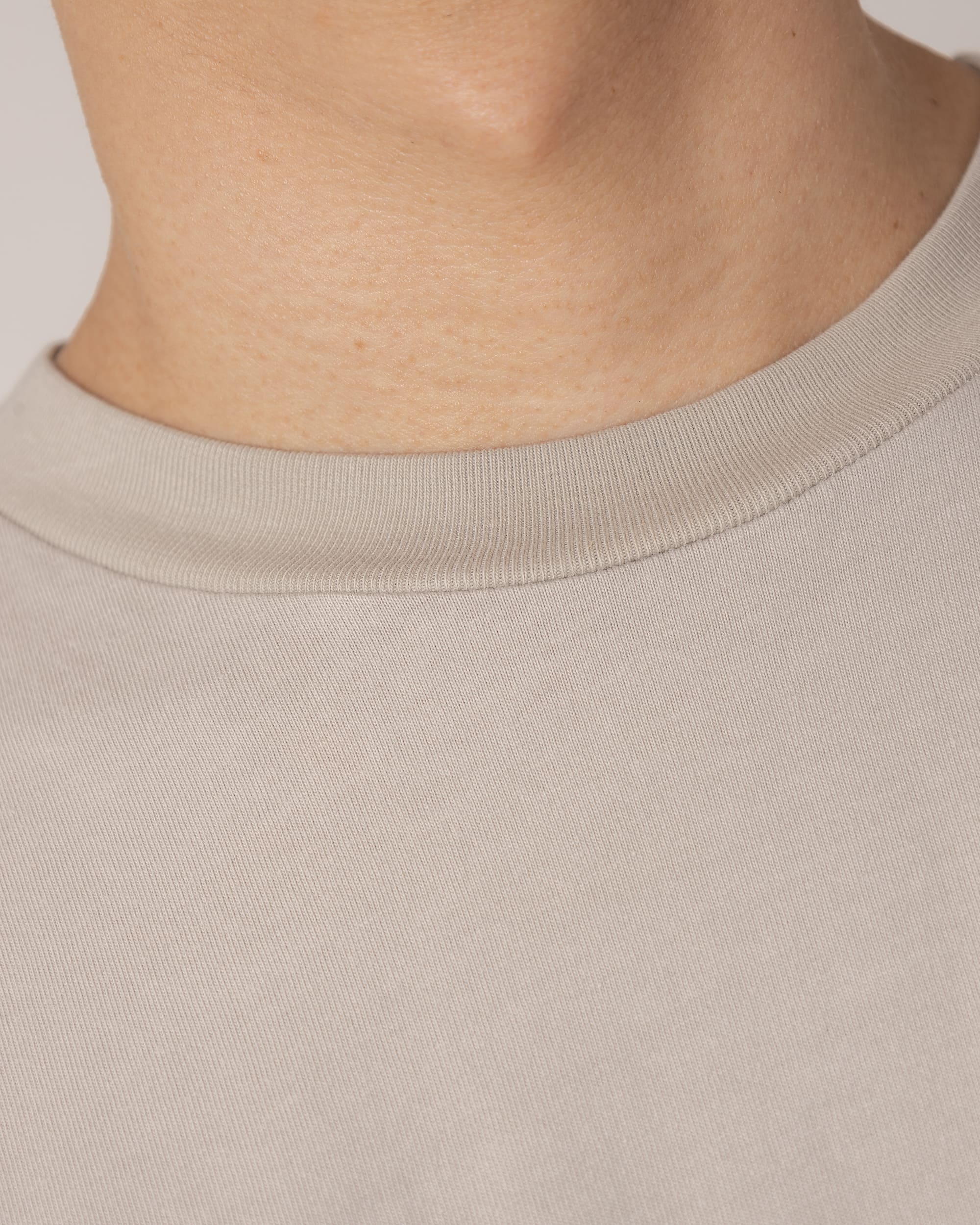 Camiseta 100% algodón, tacto frío, semi oversized con rib. Color beige y bordado punto corazón. Modelo mide 1.86 cm y usa talla L