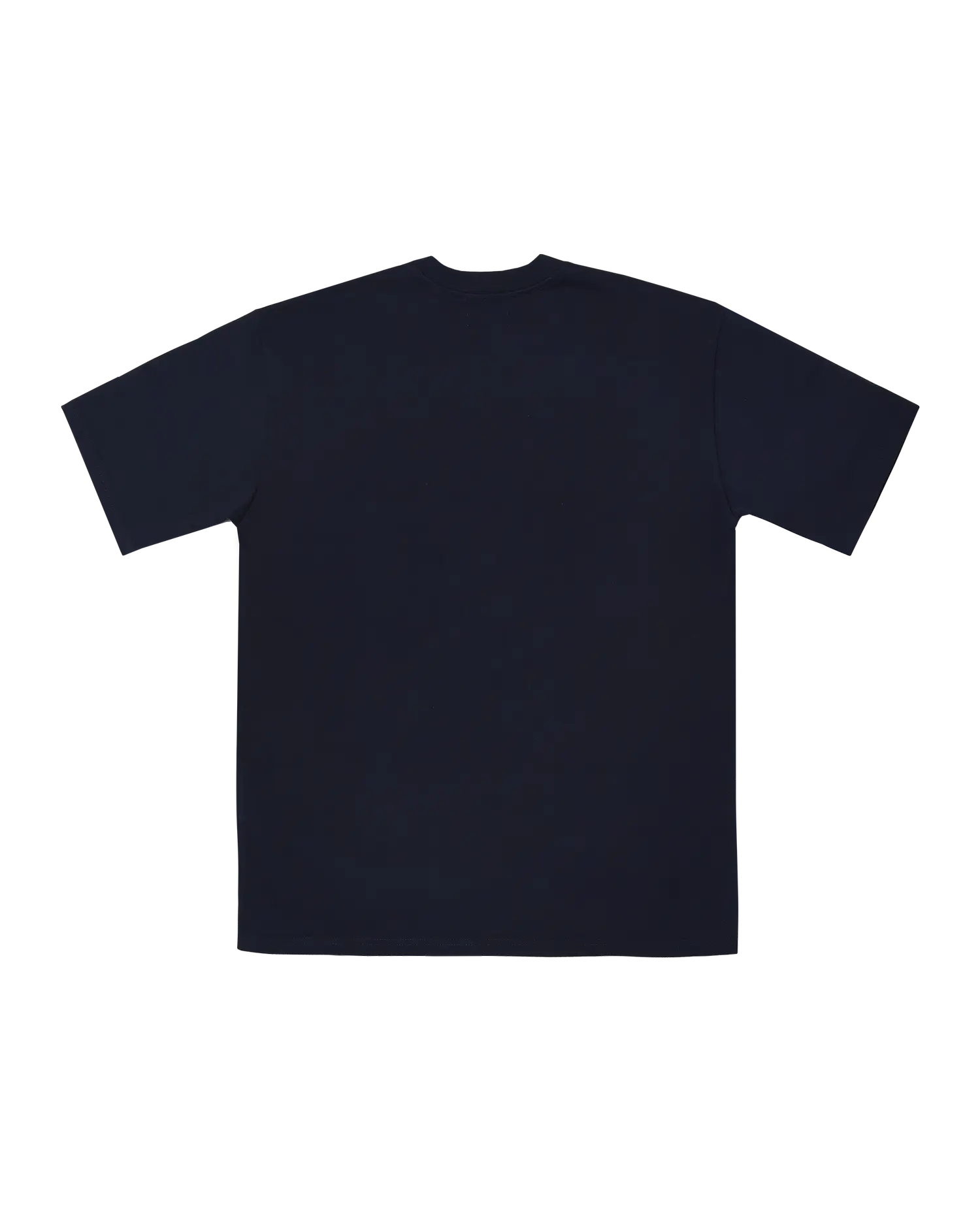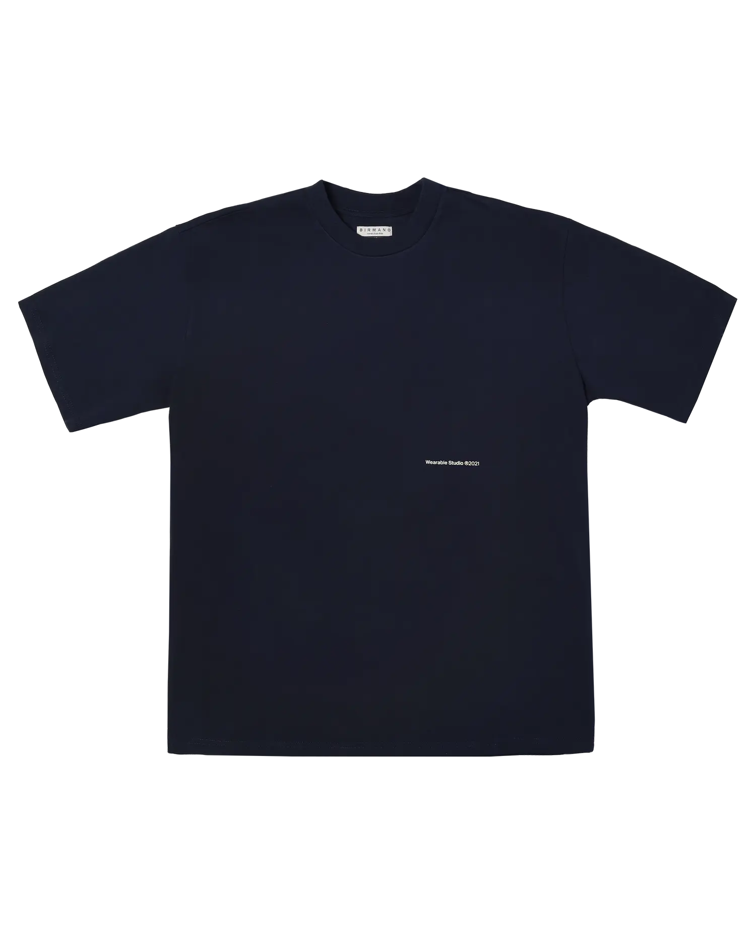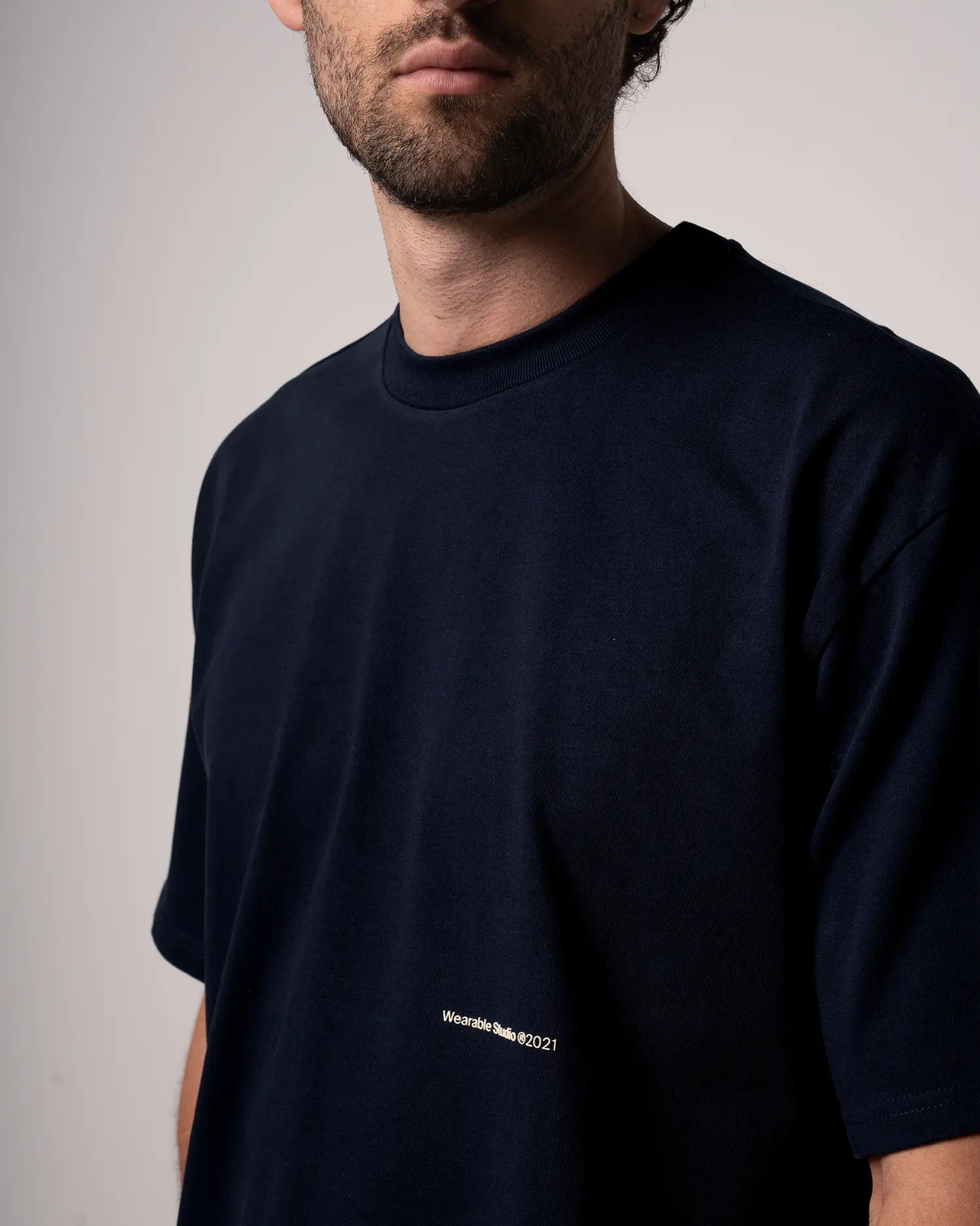 Camiseta semioversized color Azul oscuro ,100% algodón de alto gramaje (250gr) con un detalle de estampado delantero a la altura del codo color Ivory.