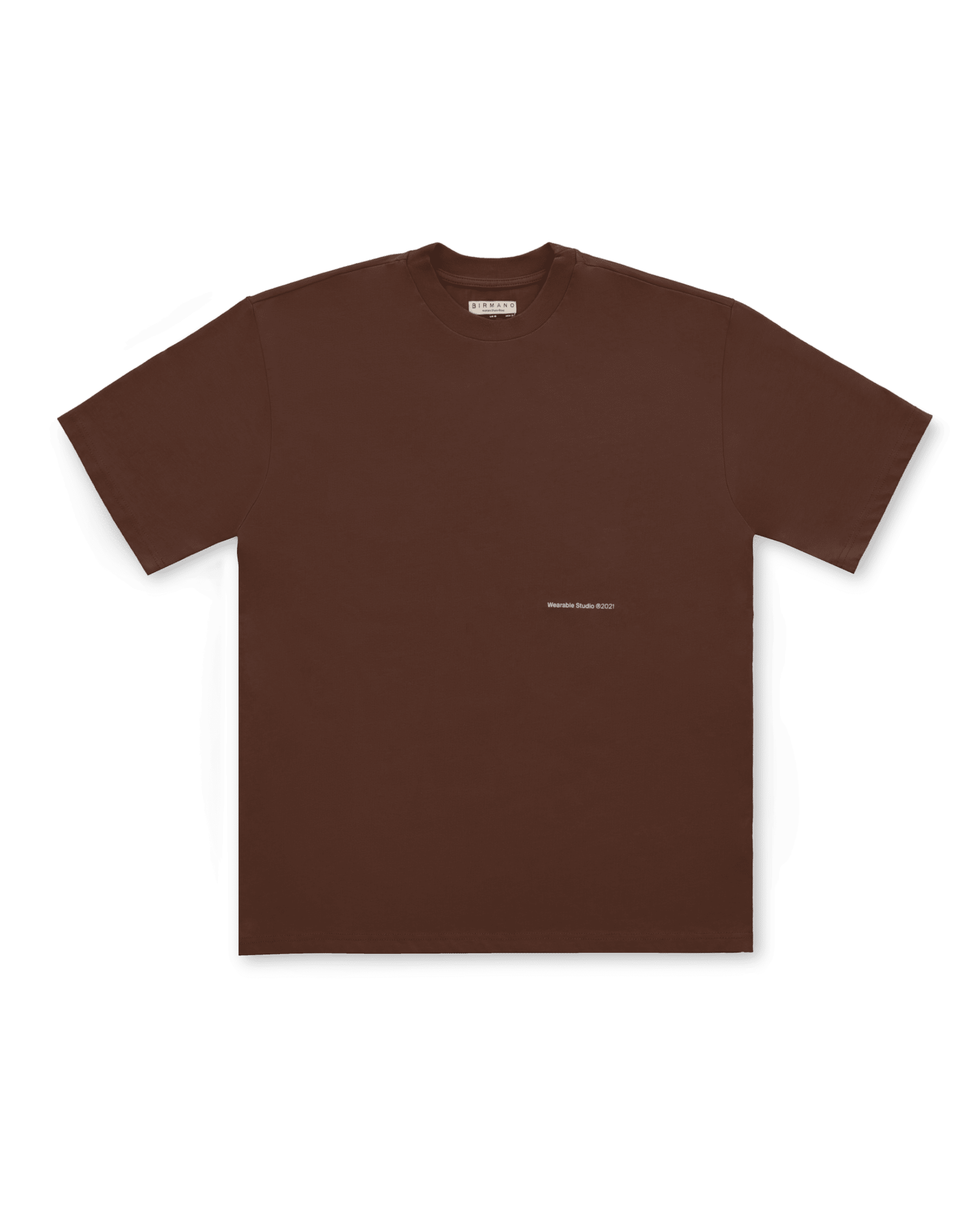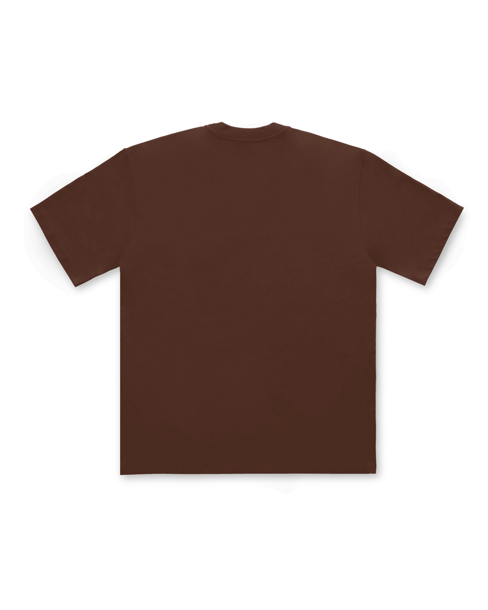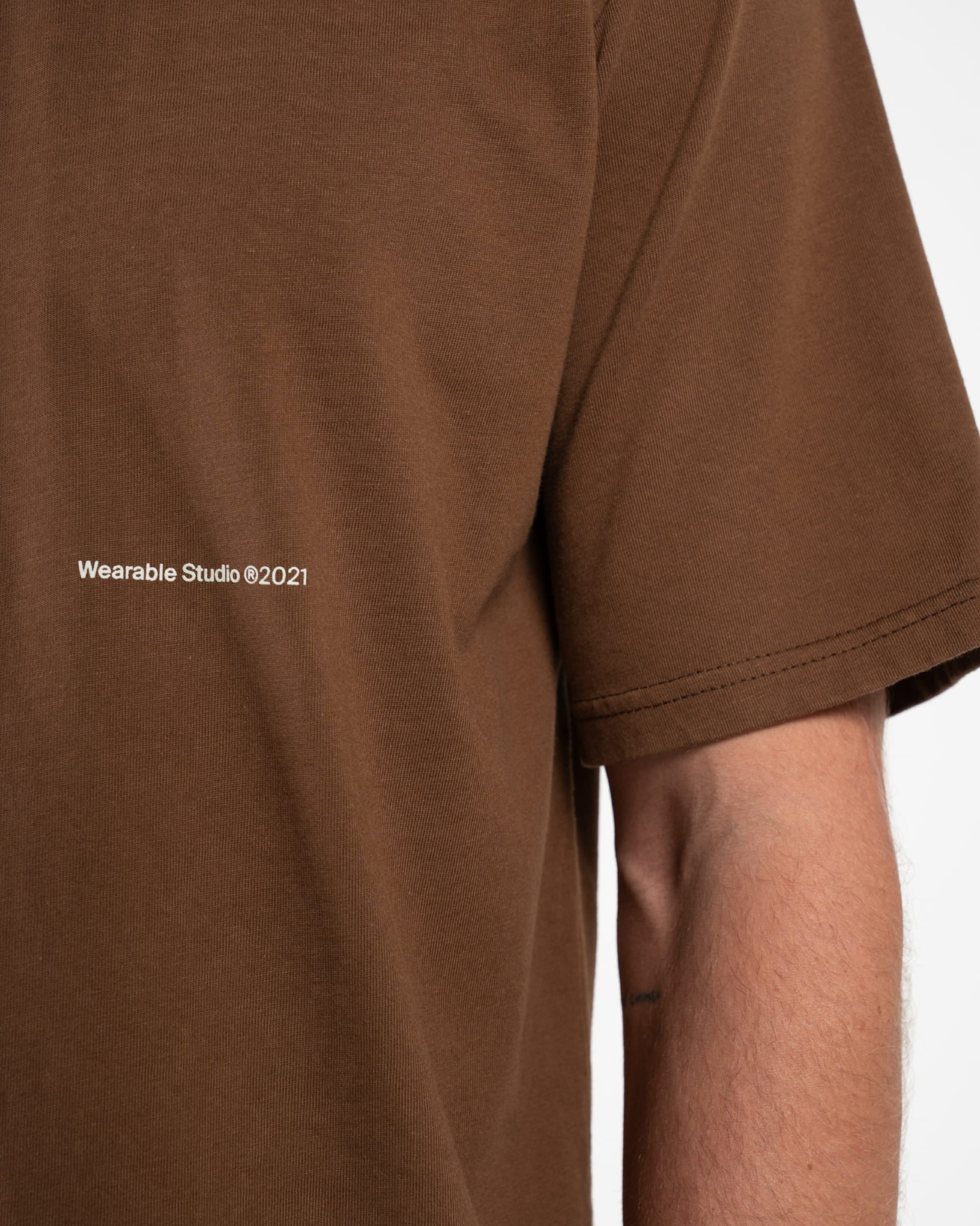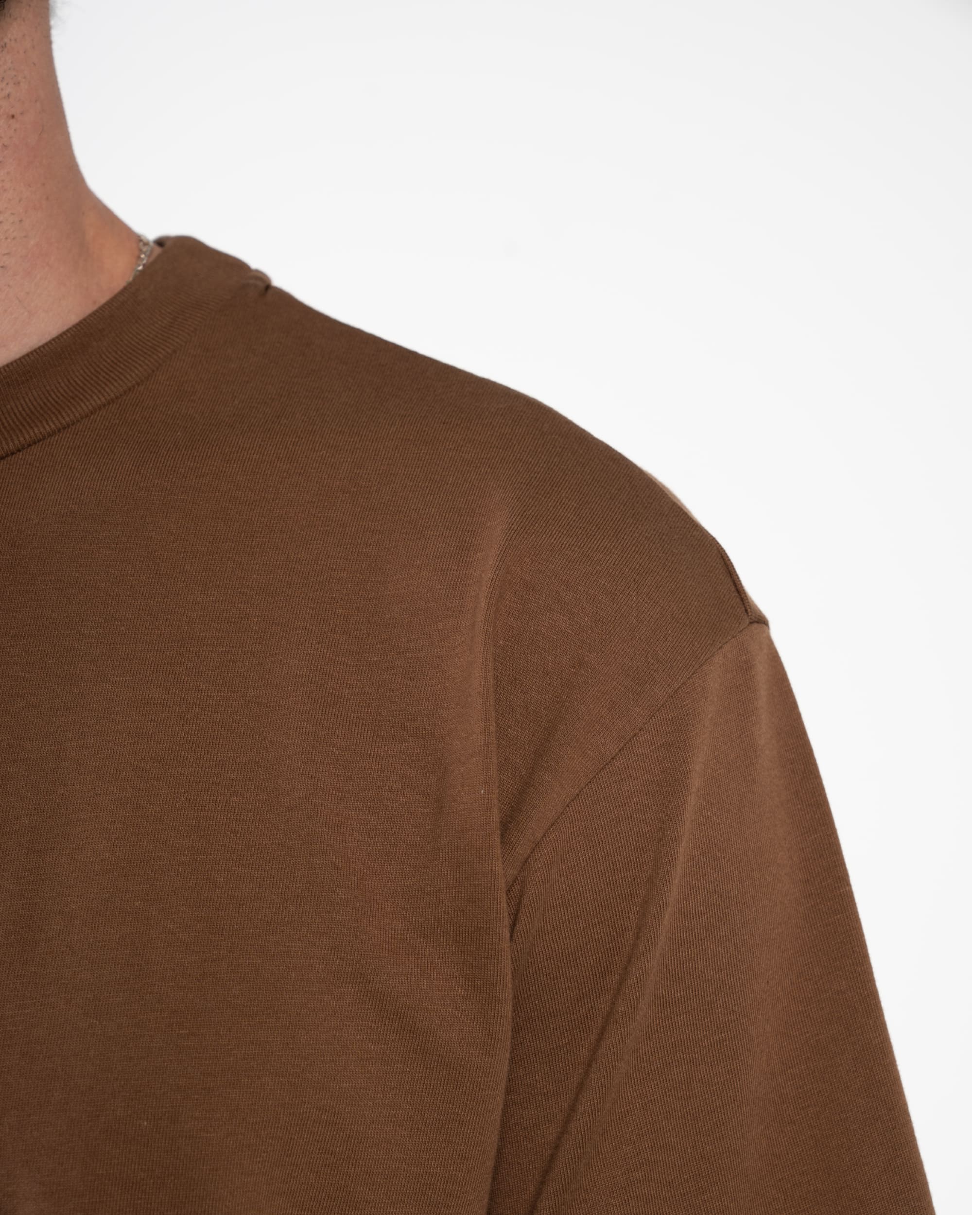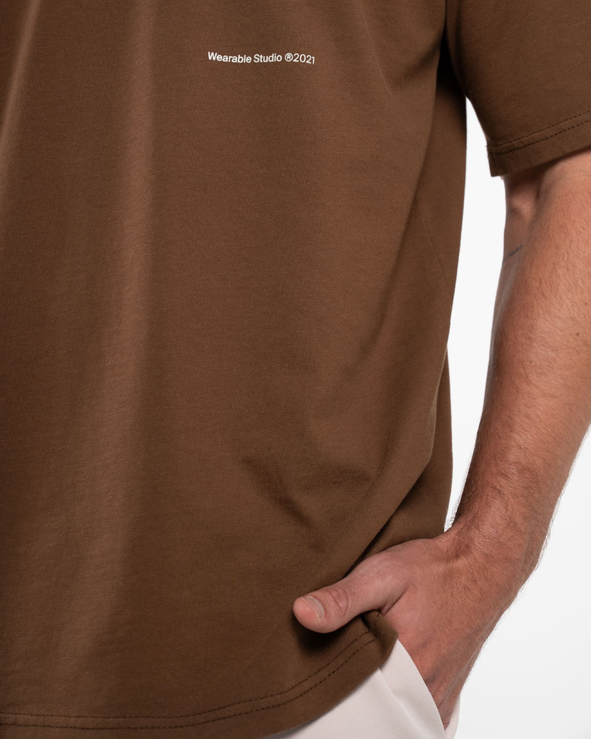Camiseta semioversized color cafe ,100% algodón de alto gramaje (250gr) con un detalle de estampado delantero a la altura del codo a tono y cuello en rib. El modelo mide 1,86cm y usa la talla XL