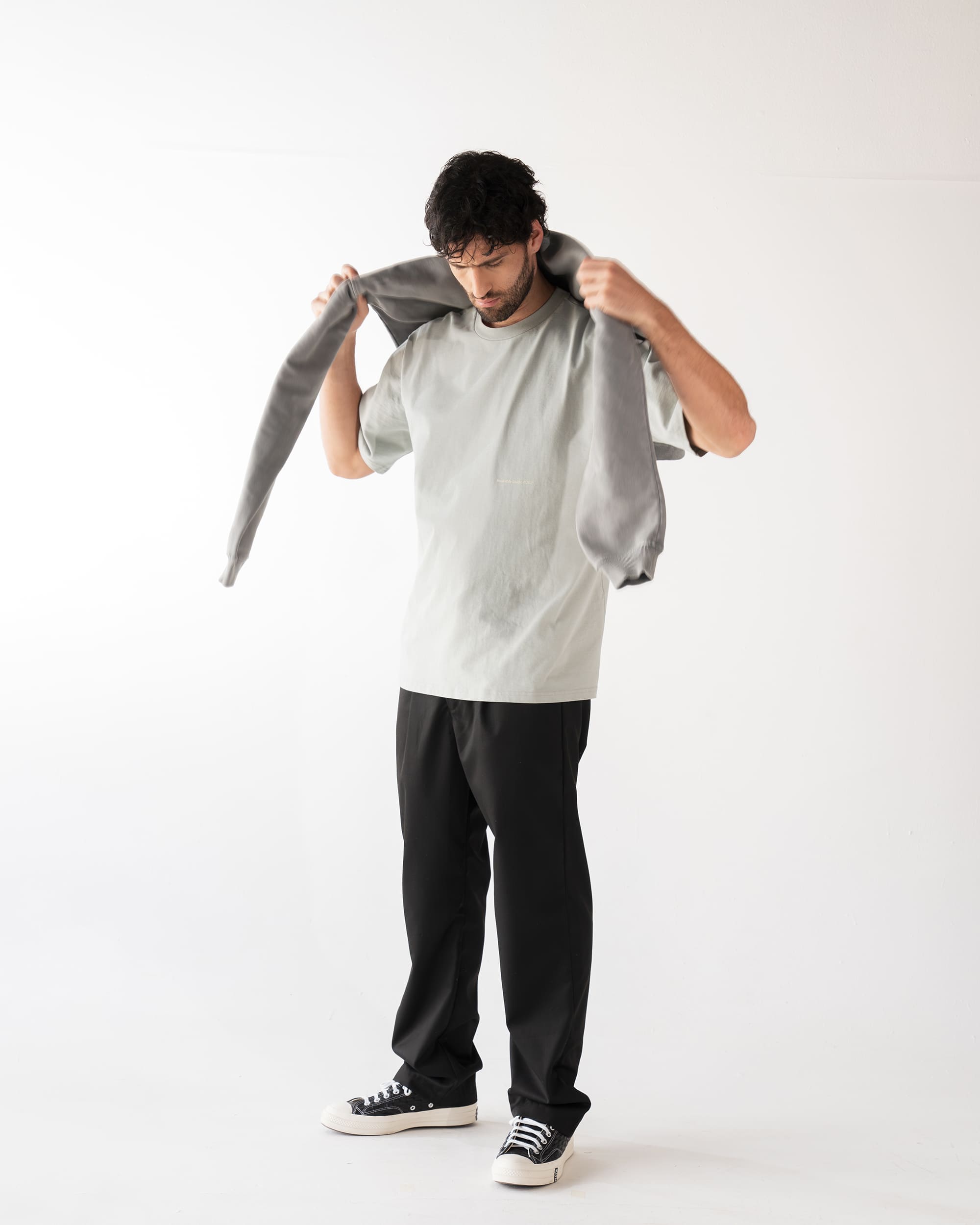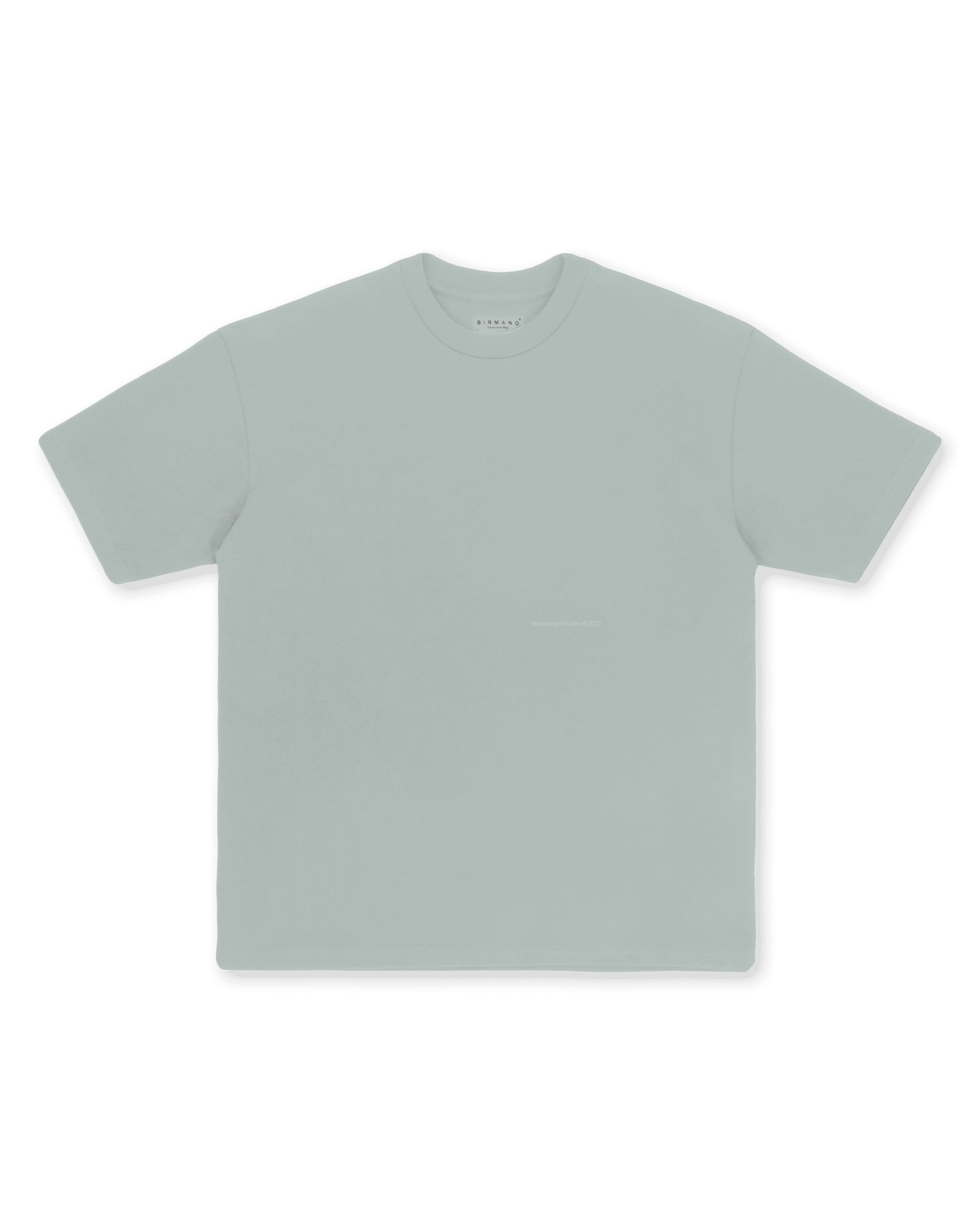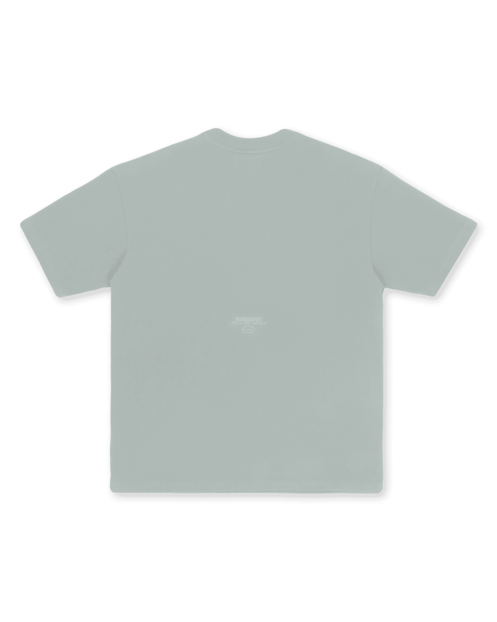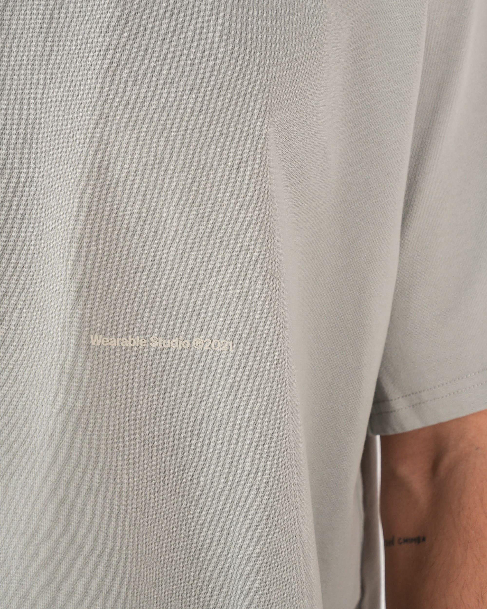 Camiseta semioversized color gris claro ,100% algodón de alto gramaje (250gr) con un detalle de estampado delantero a la altura del codo a tono y cuello en rib. El modelo mide 1,86cm y usa la talla XL