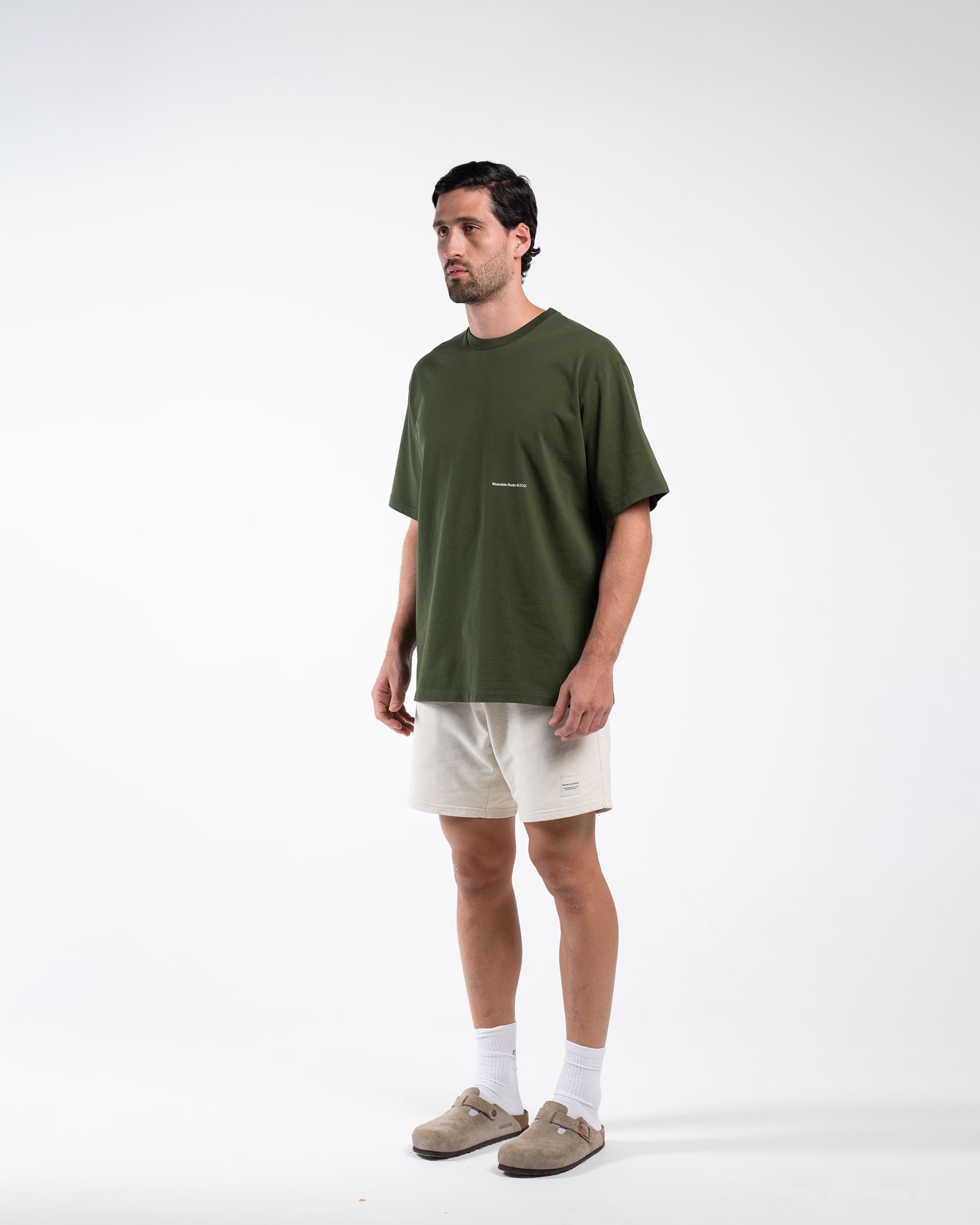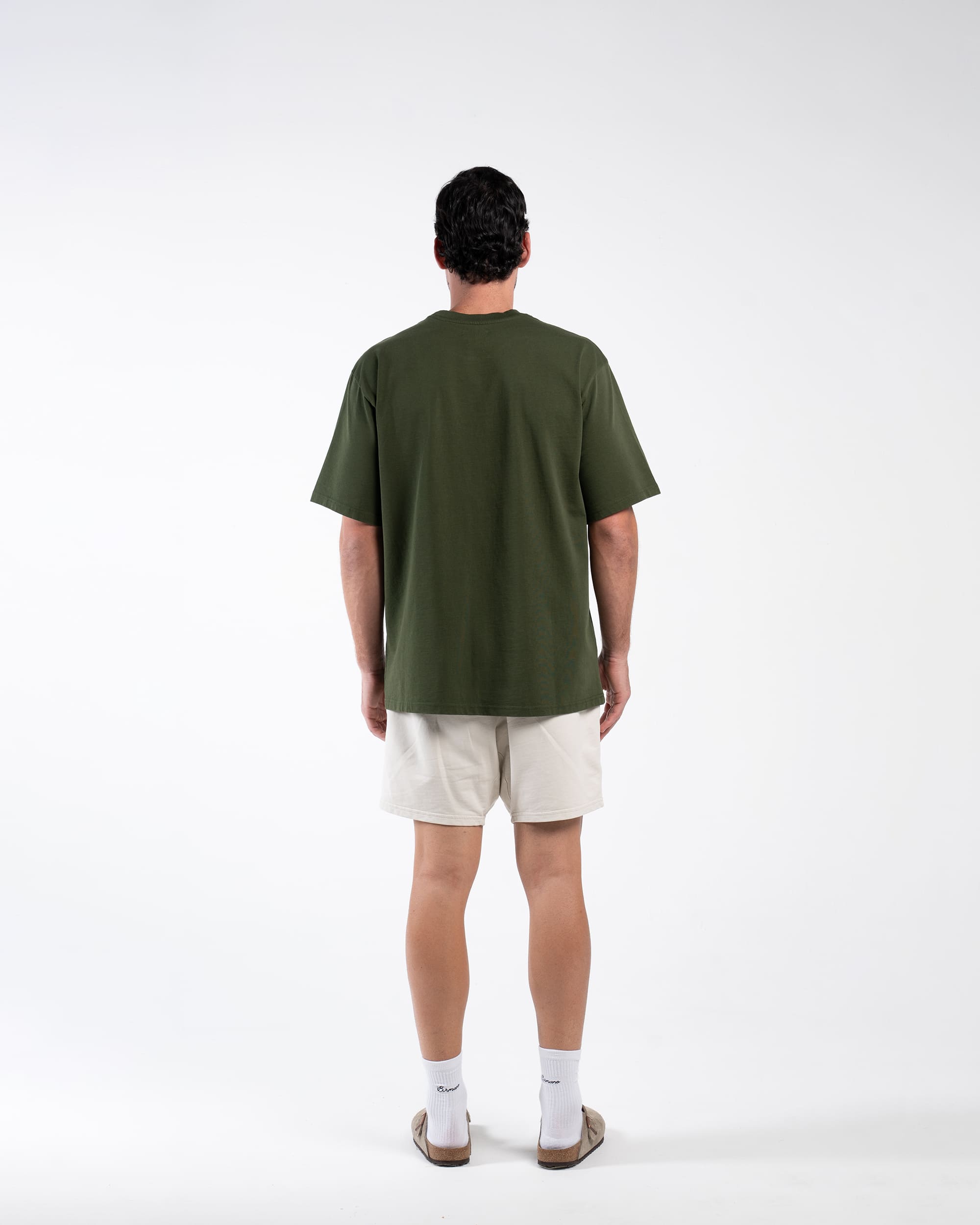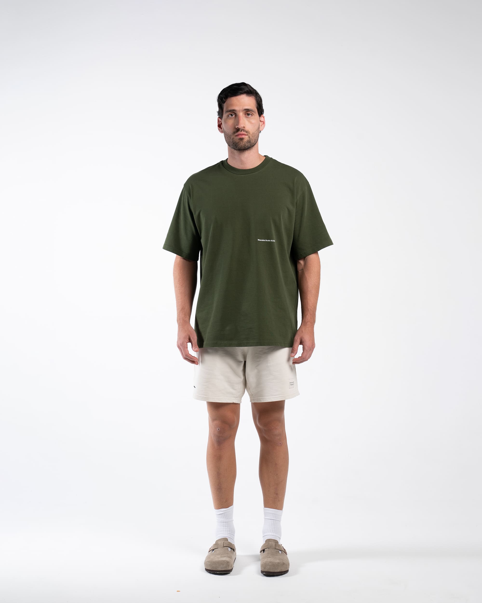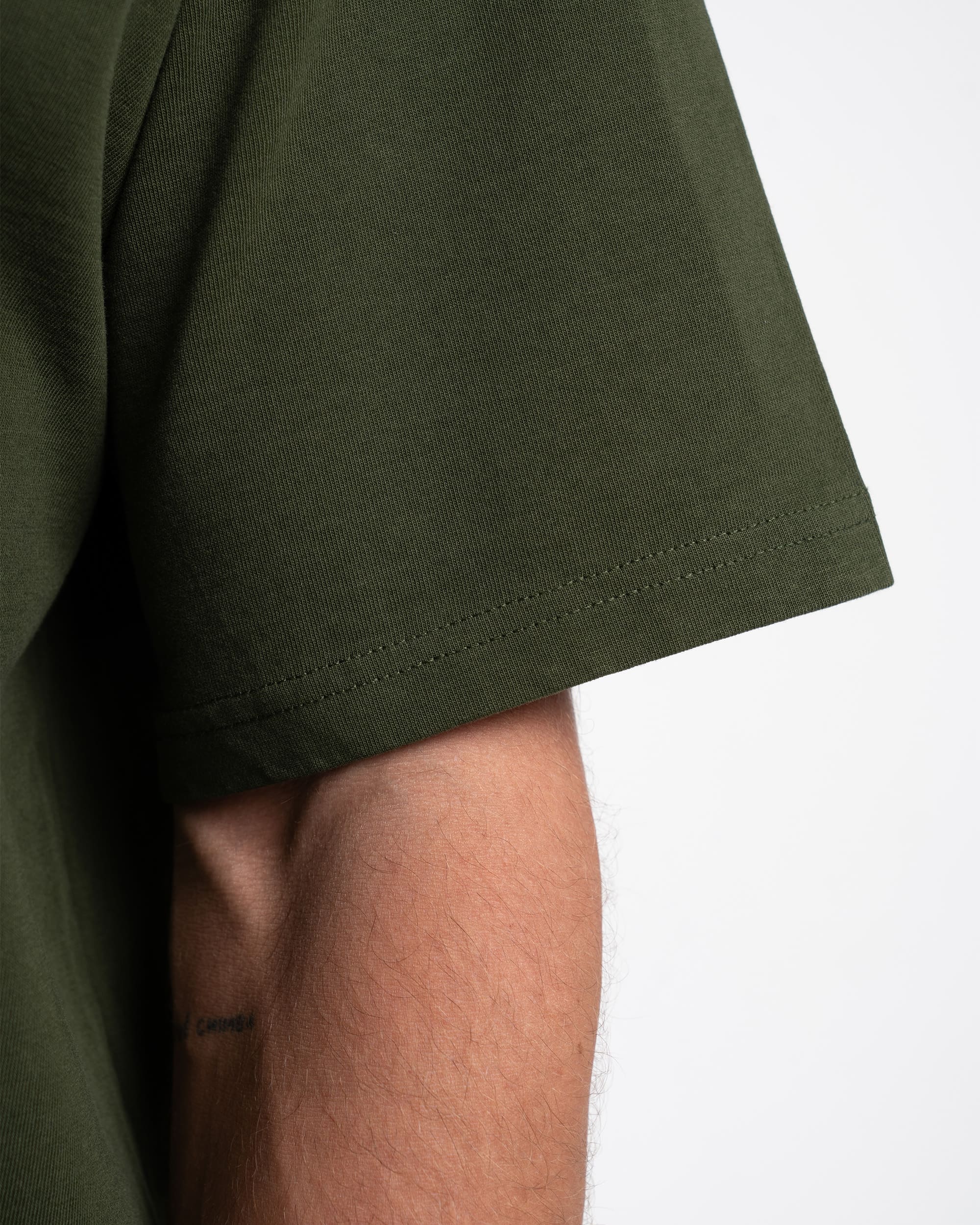 Camiseta semioversized color verde ,100% algodón de alto gramaje (250gr) con un detalle de estampado delantero a la altura del codo a tono y cuello en rib. El modelo mide 1,86cm y usa la talla XL