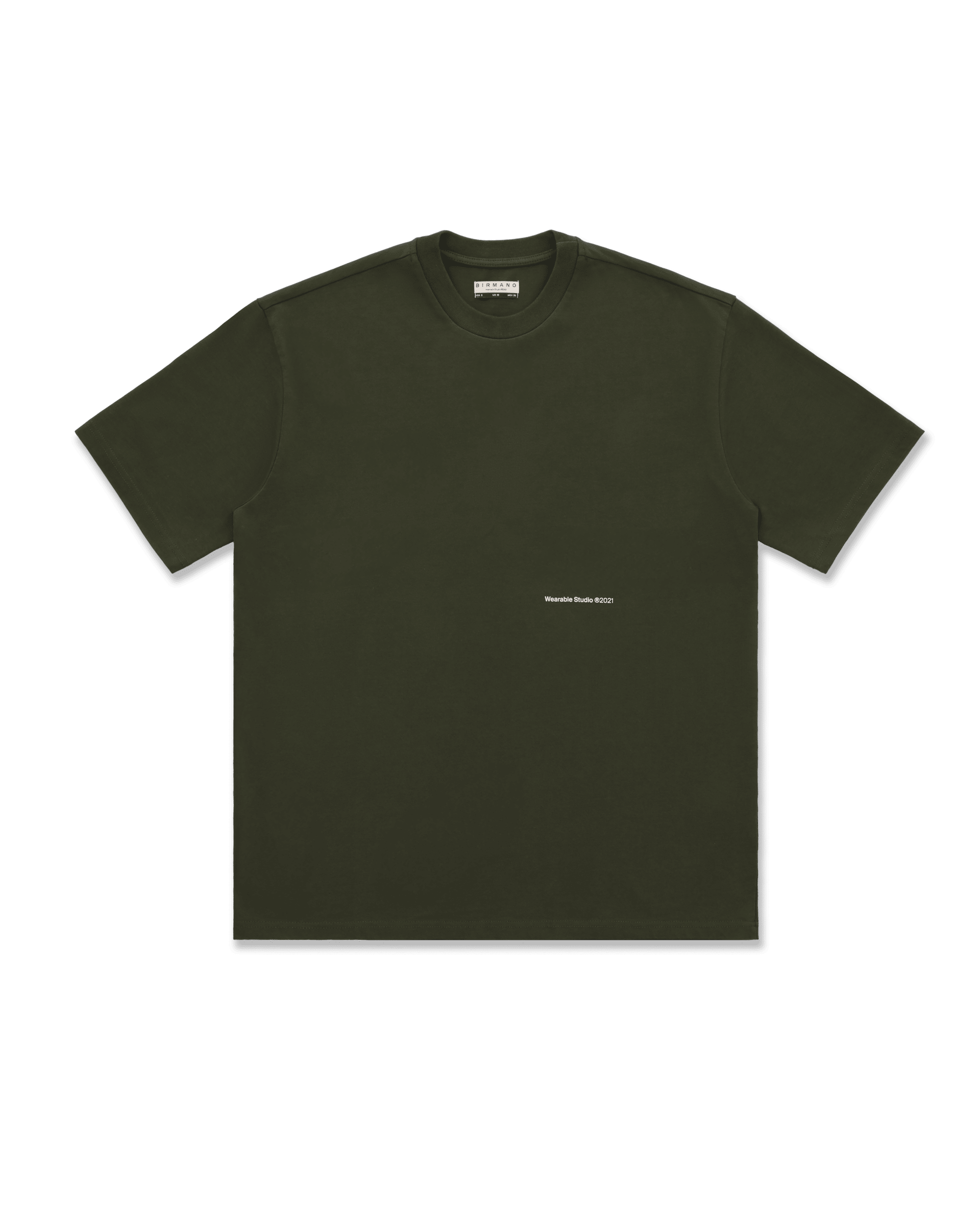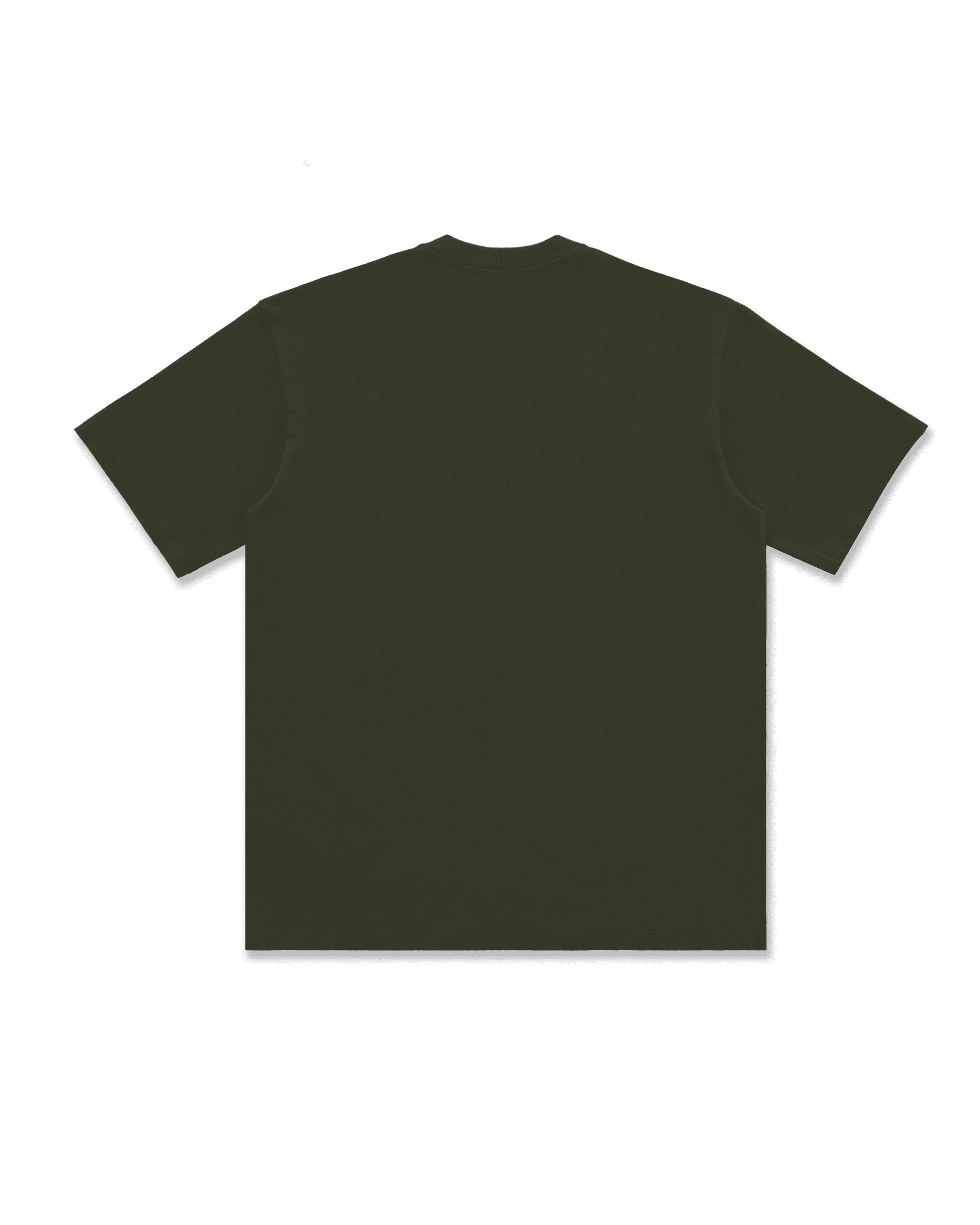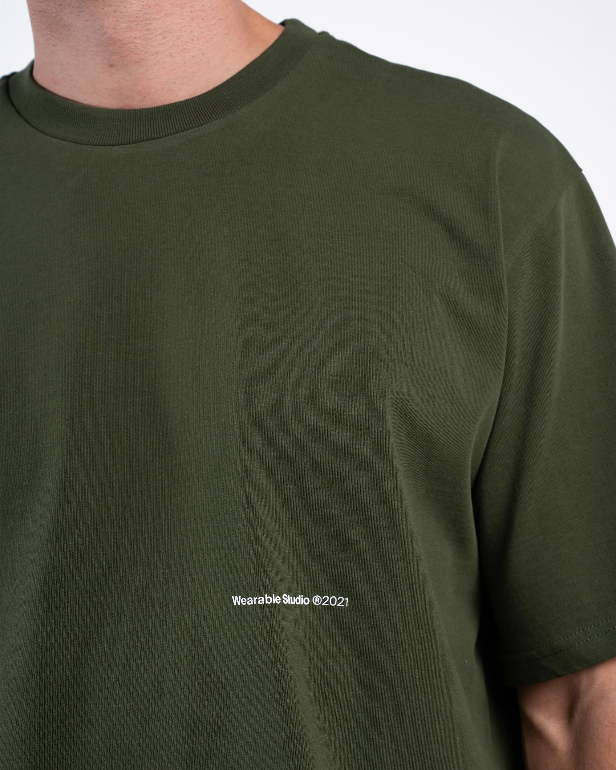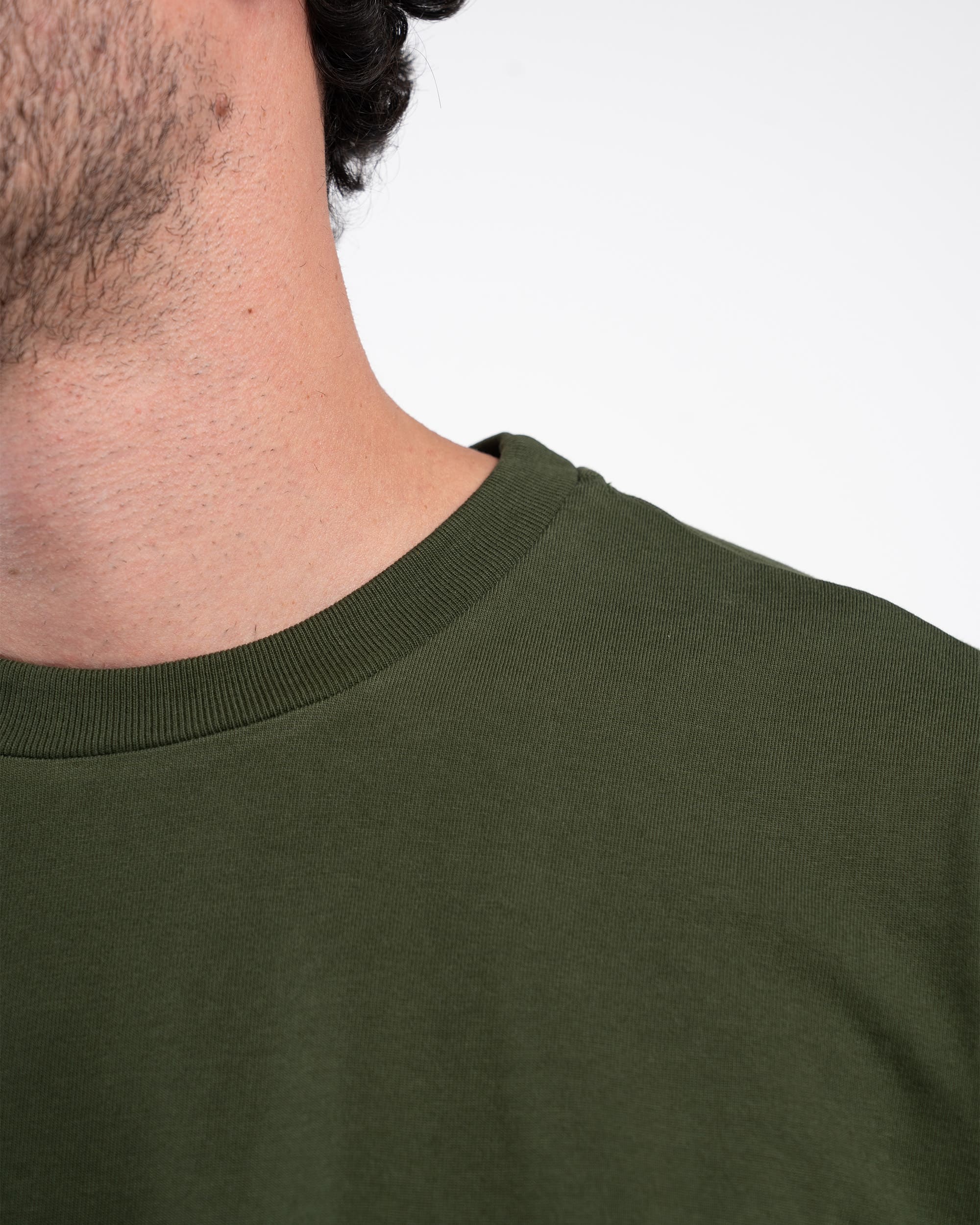 Camiseta semioversized color verde ,100% algodón de alto gramaje (250gr) con un detalle de estampado delantero a la altura del codo a tono y cuello en rib. El modelo mide 1,86cm y usa la talla XL