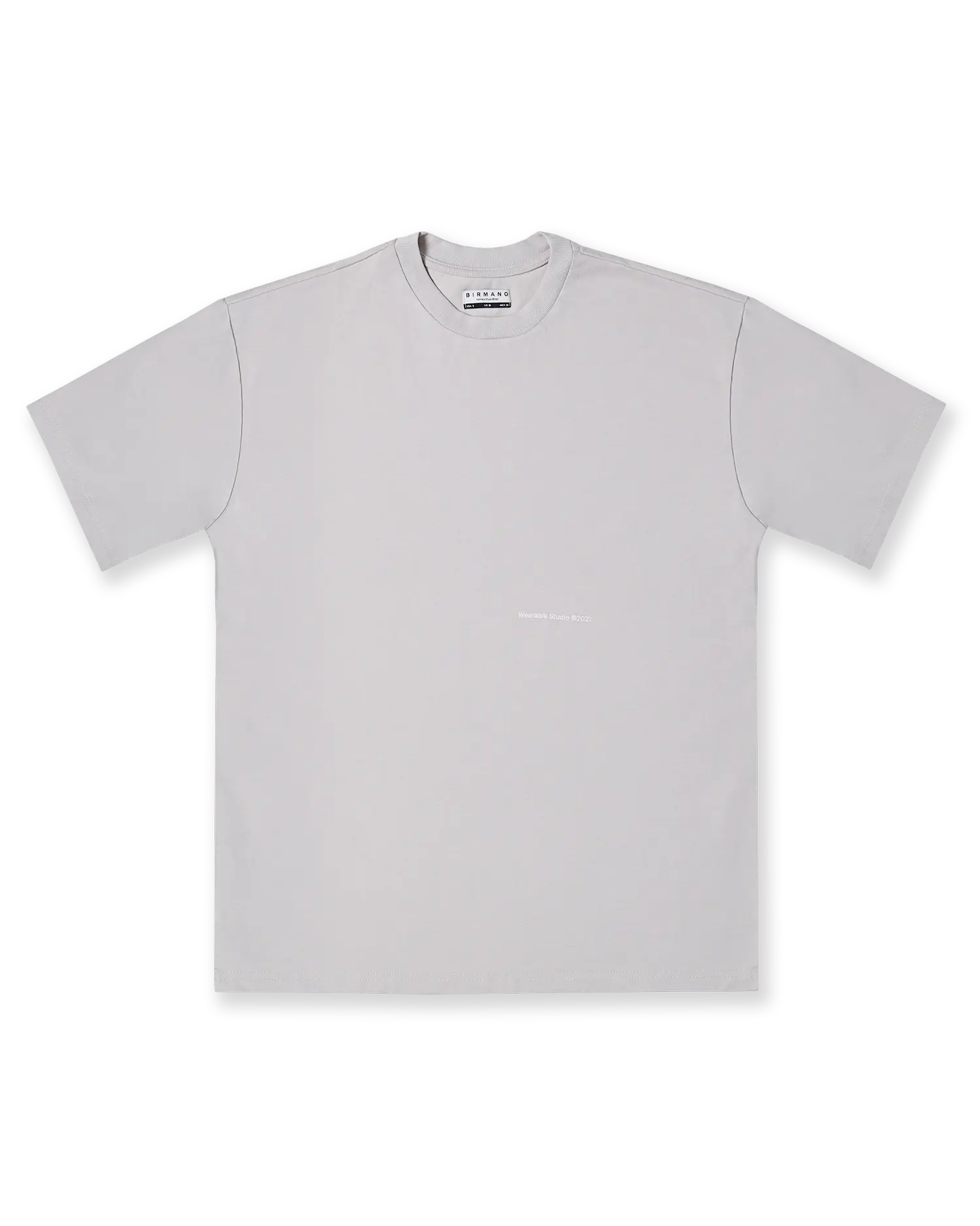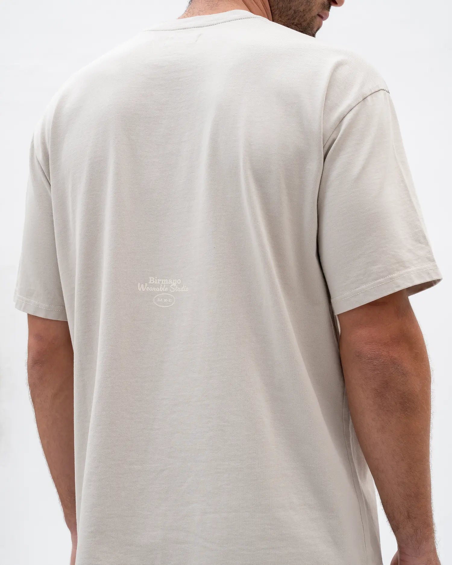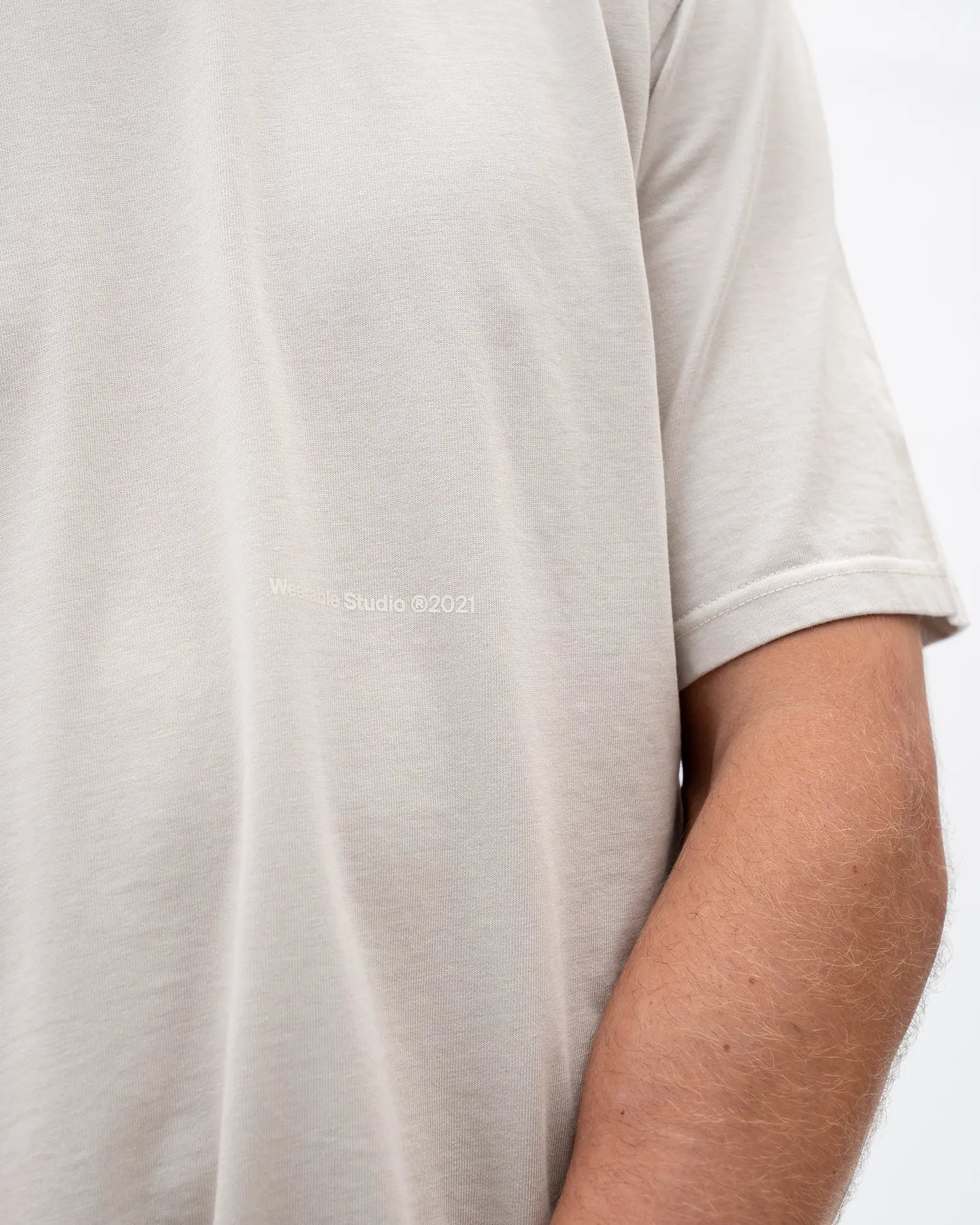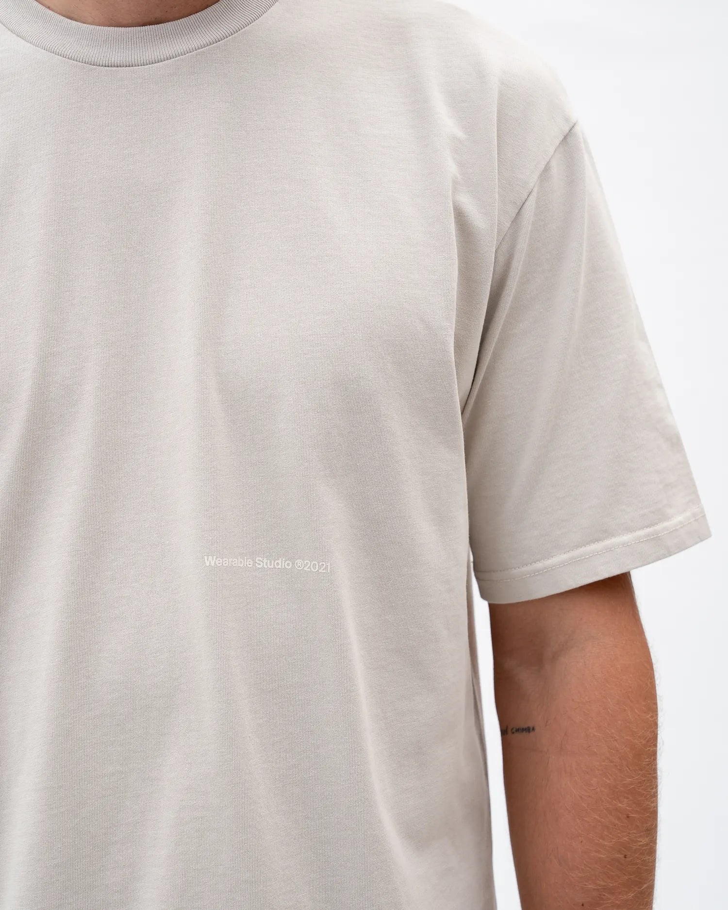 Camiseta semioversized color Gris Claro, 100% algodón de alto gramaje (250gr) con un detalle de estampado delantero a la altura del codo color Ivory.