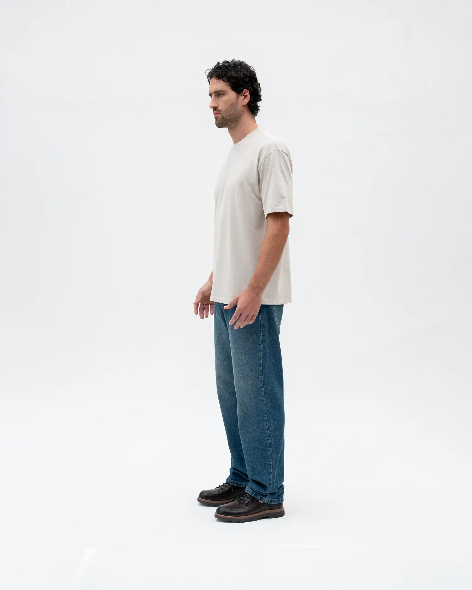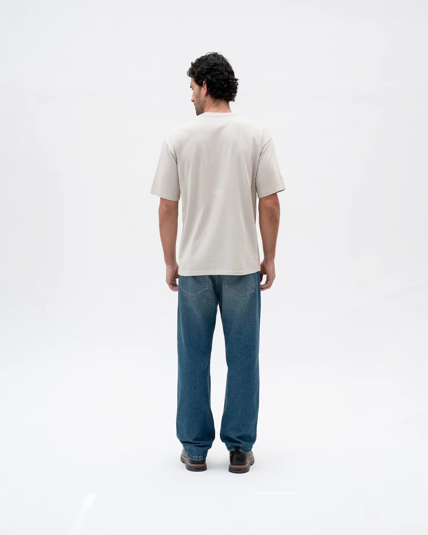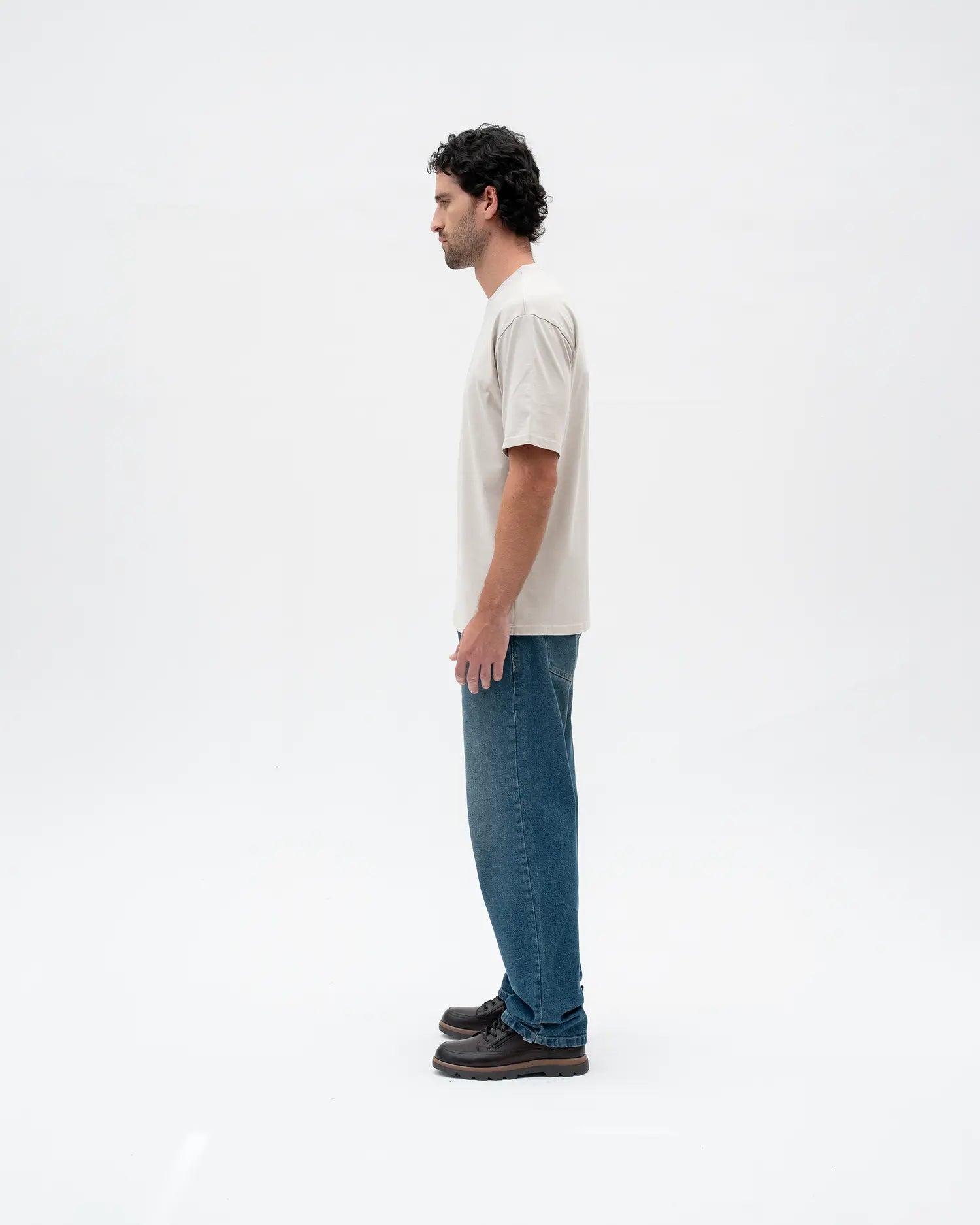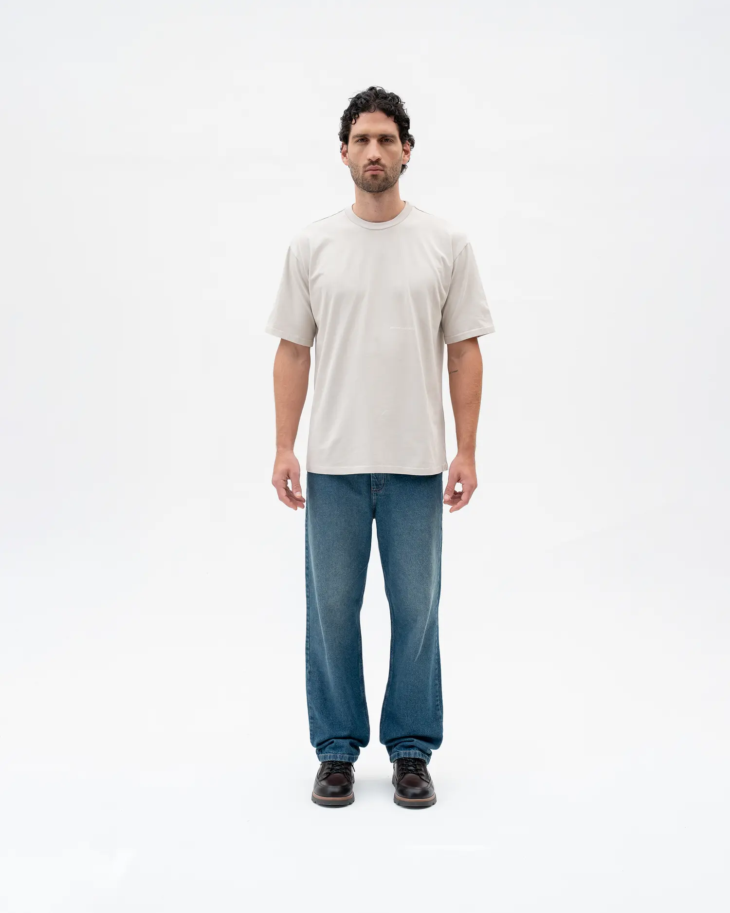 Camiseta semioversized color Gris Claro, 100% algodón de alto gramaje (250gr) con un detalle de estampado delantero a la altura del codo color Ivory.