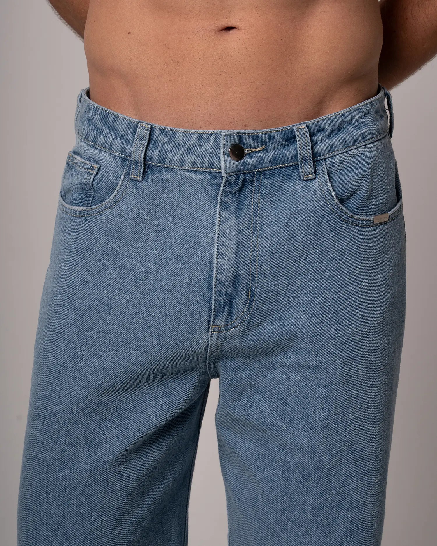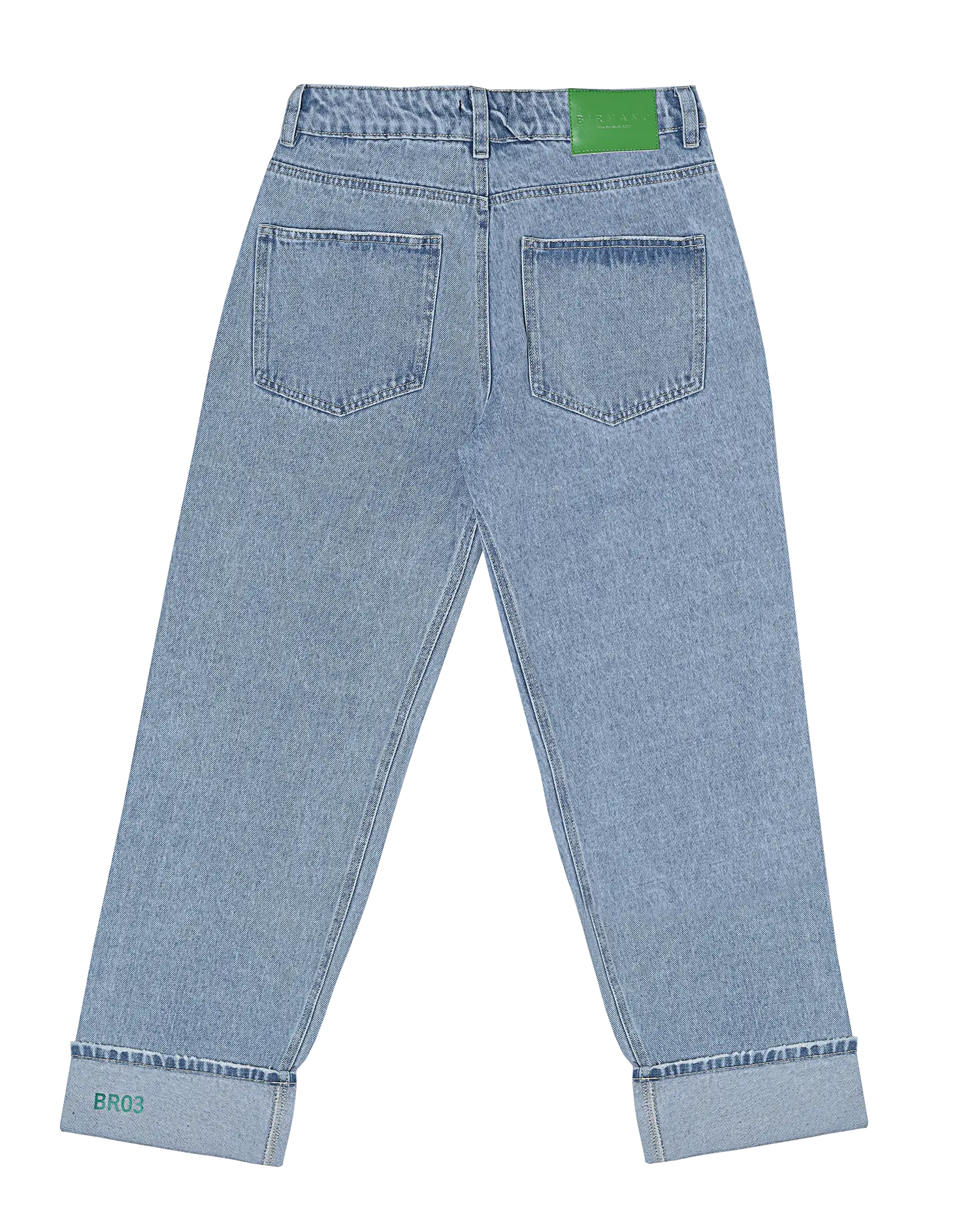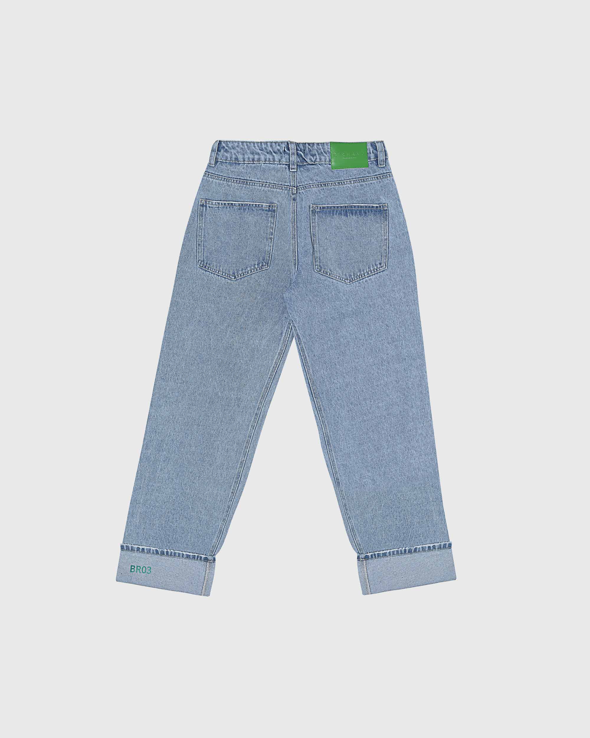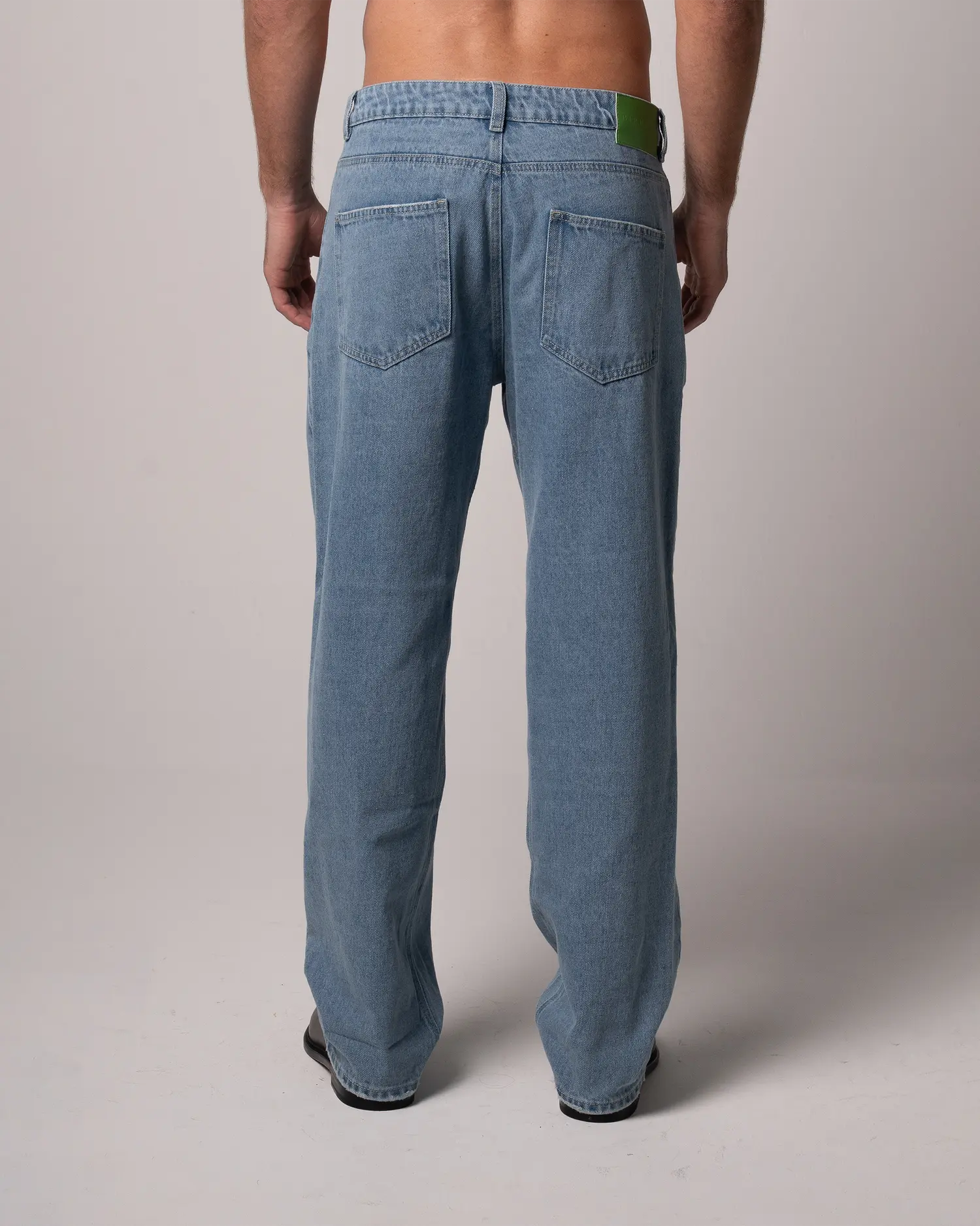 Jean bota recta 100% algodón en un tono Medium Blue. Garra verde en posterior derecho y placa wearable studio en bolsillo delantero. Botón y cierre.
