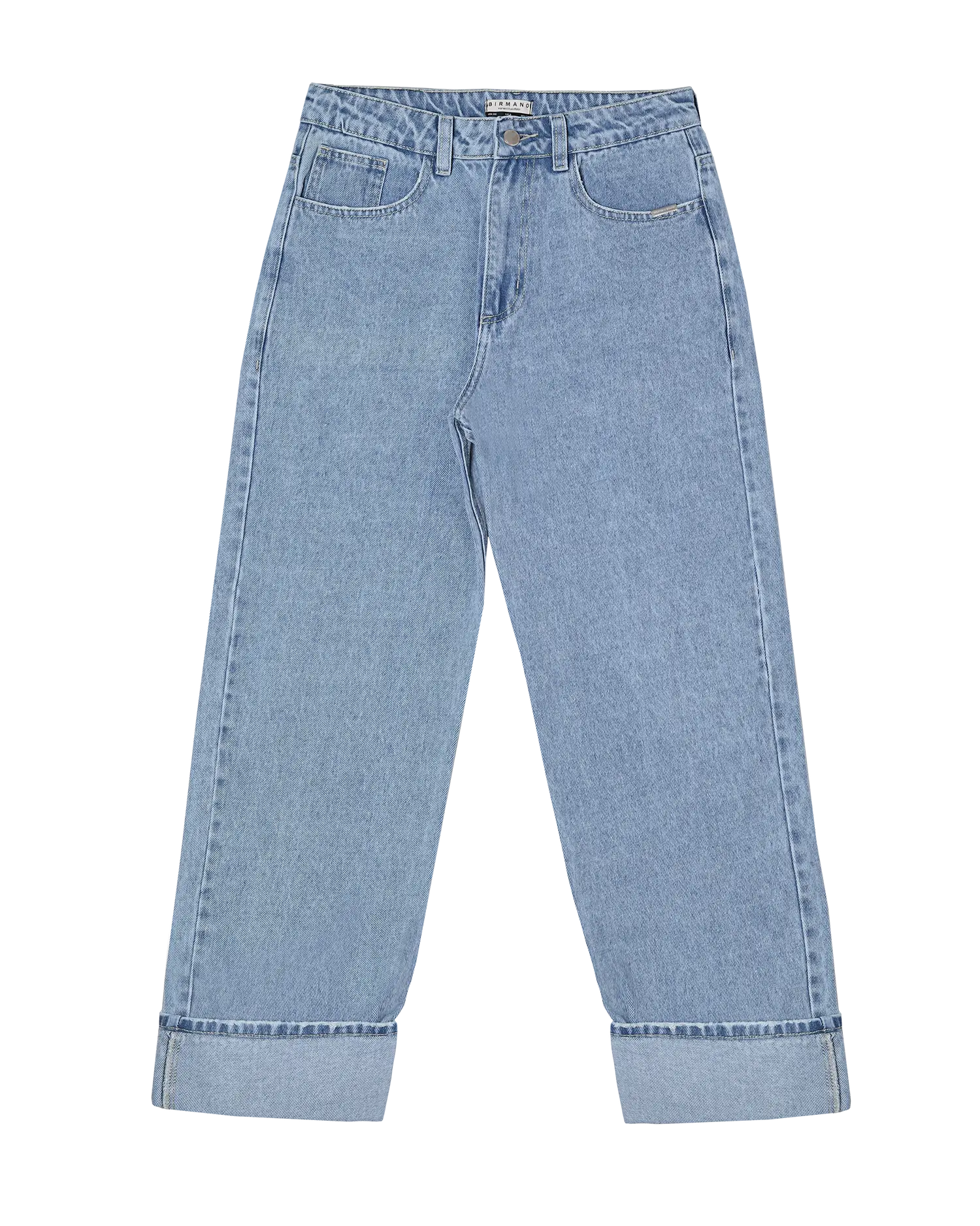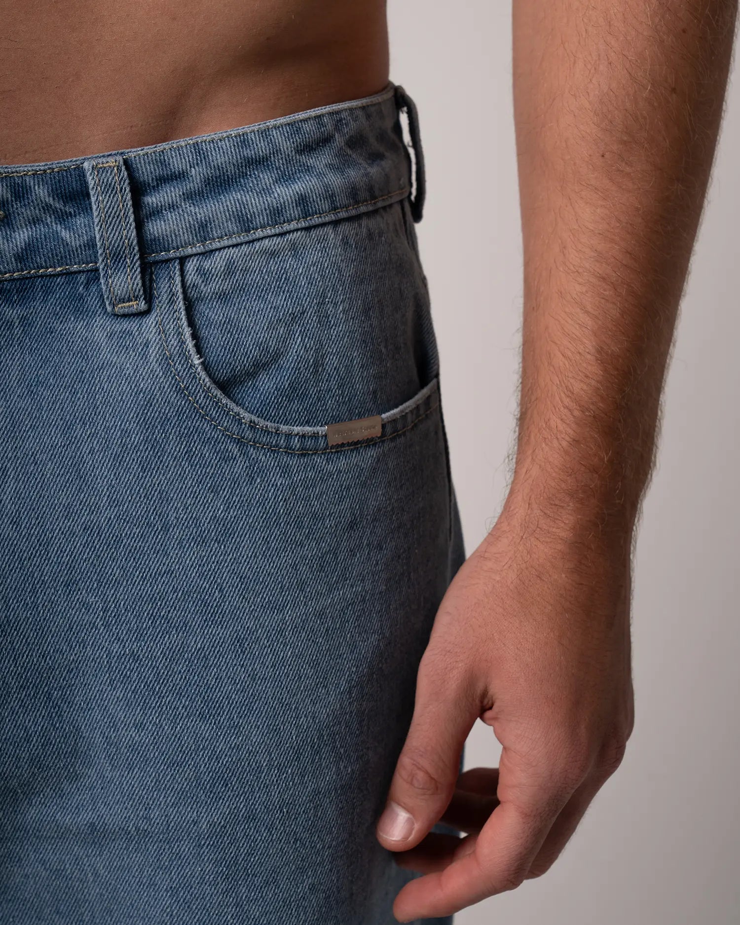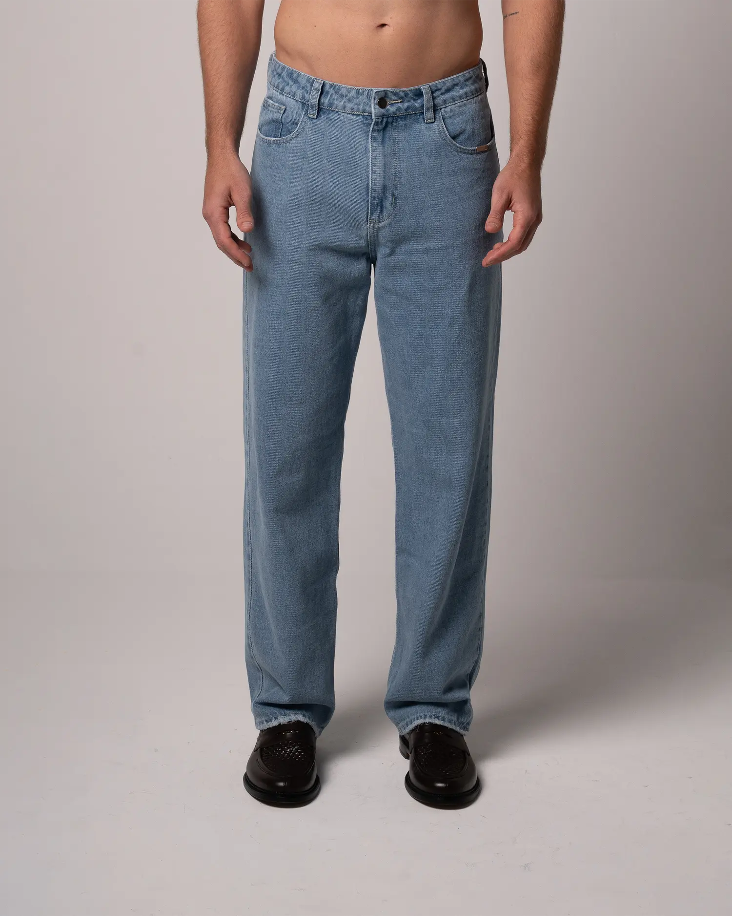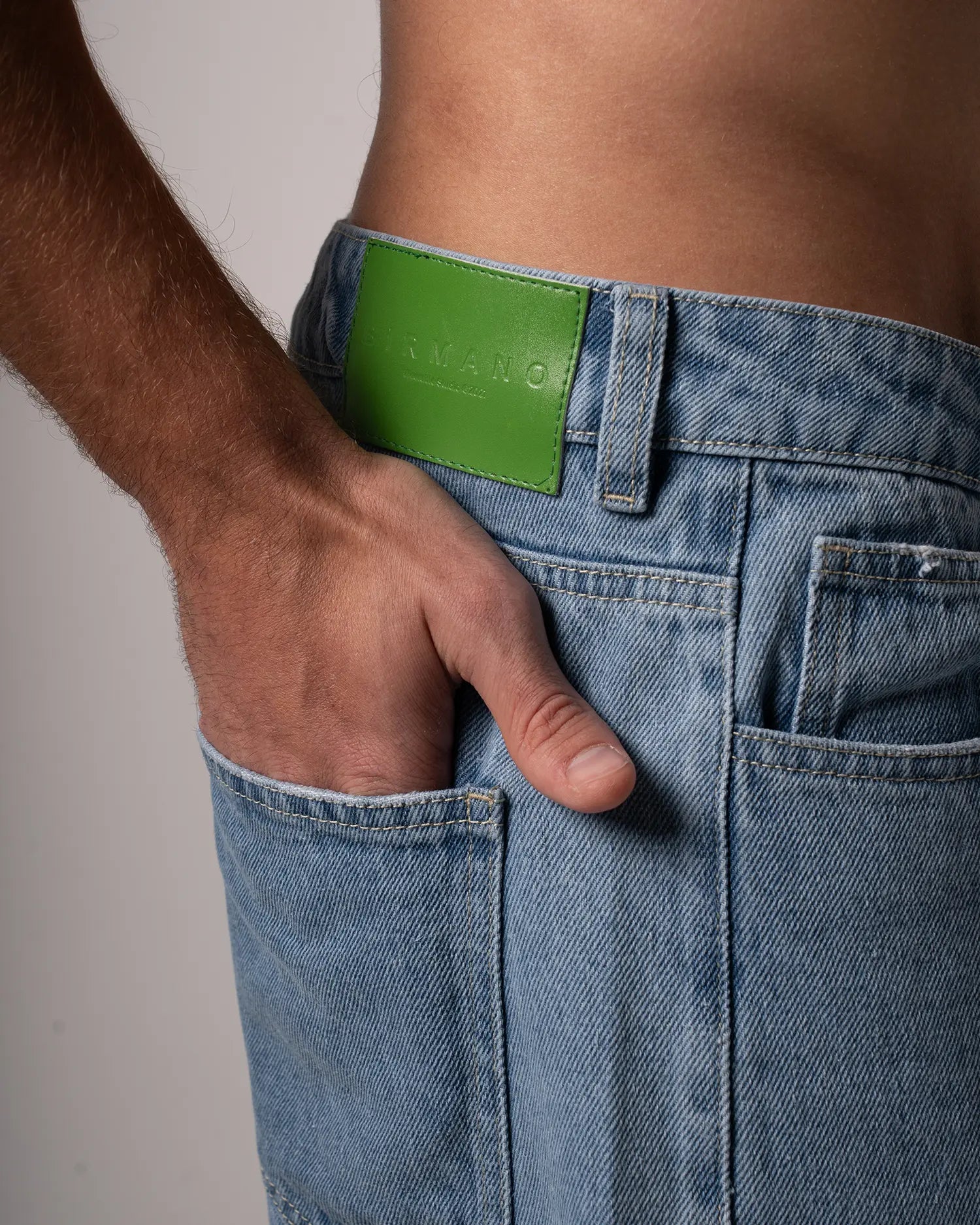 Jean bota recta 100% algodón en un tono Medium Blue. Garra verde en posterior derecho y placa wearable studio en bolsillo delantero. Botón y cierre.