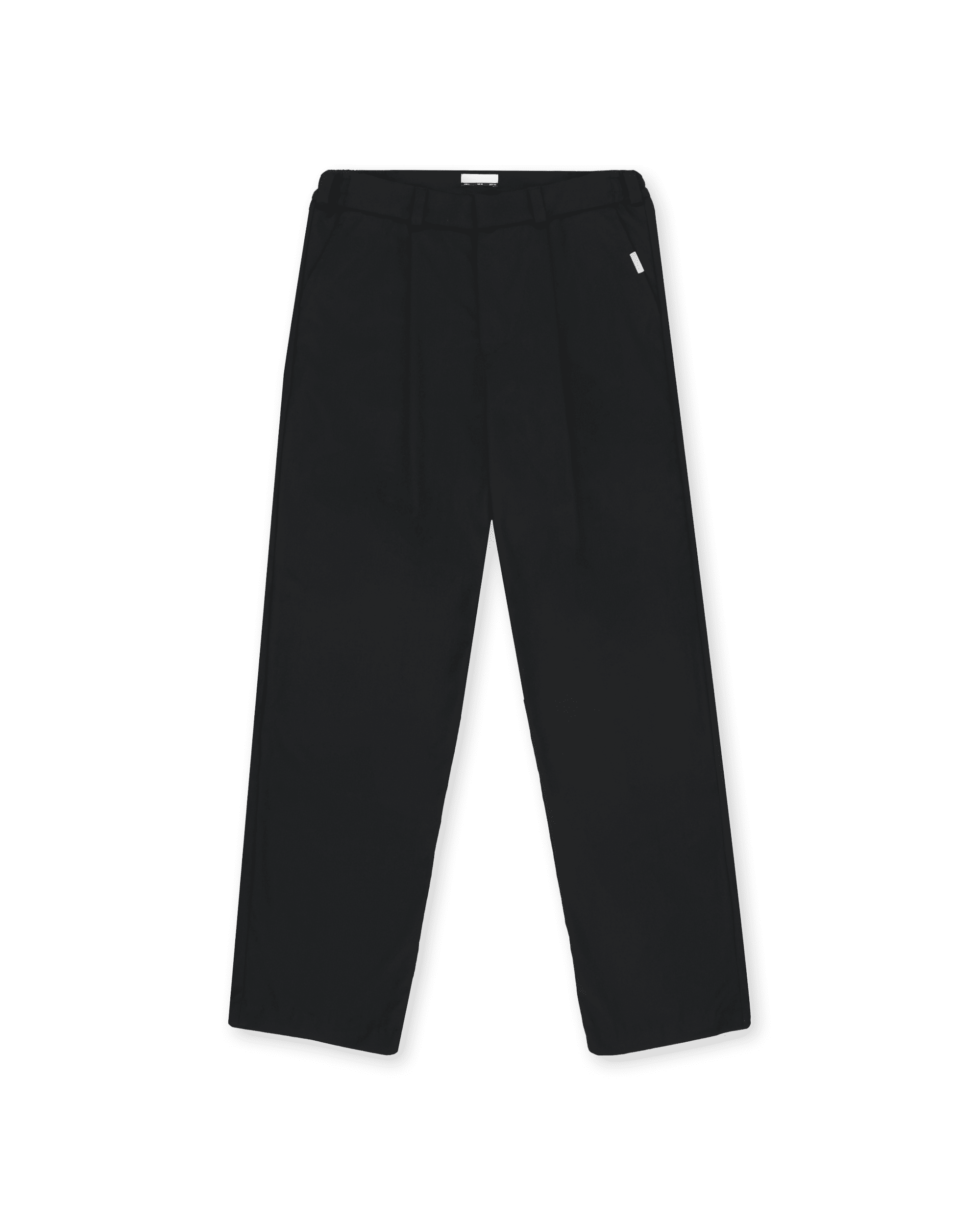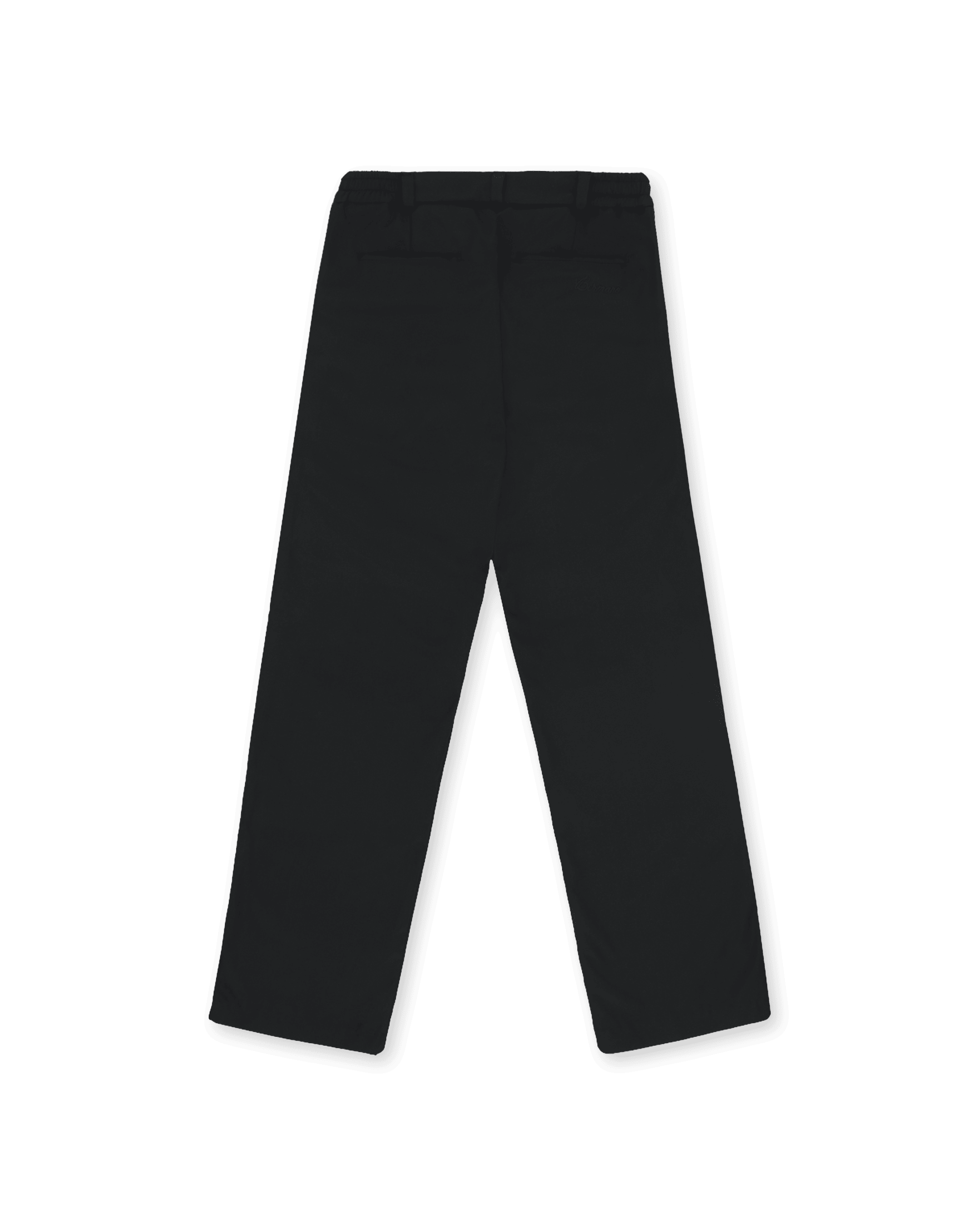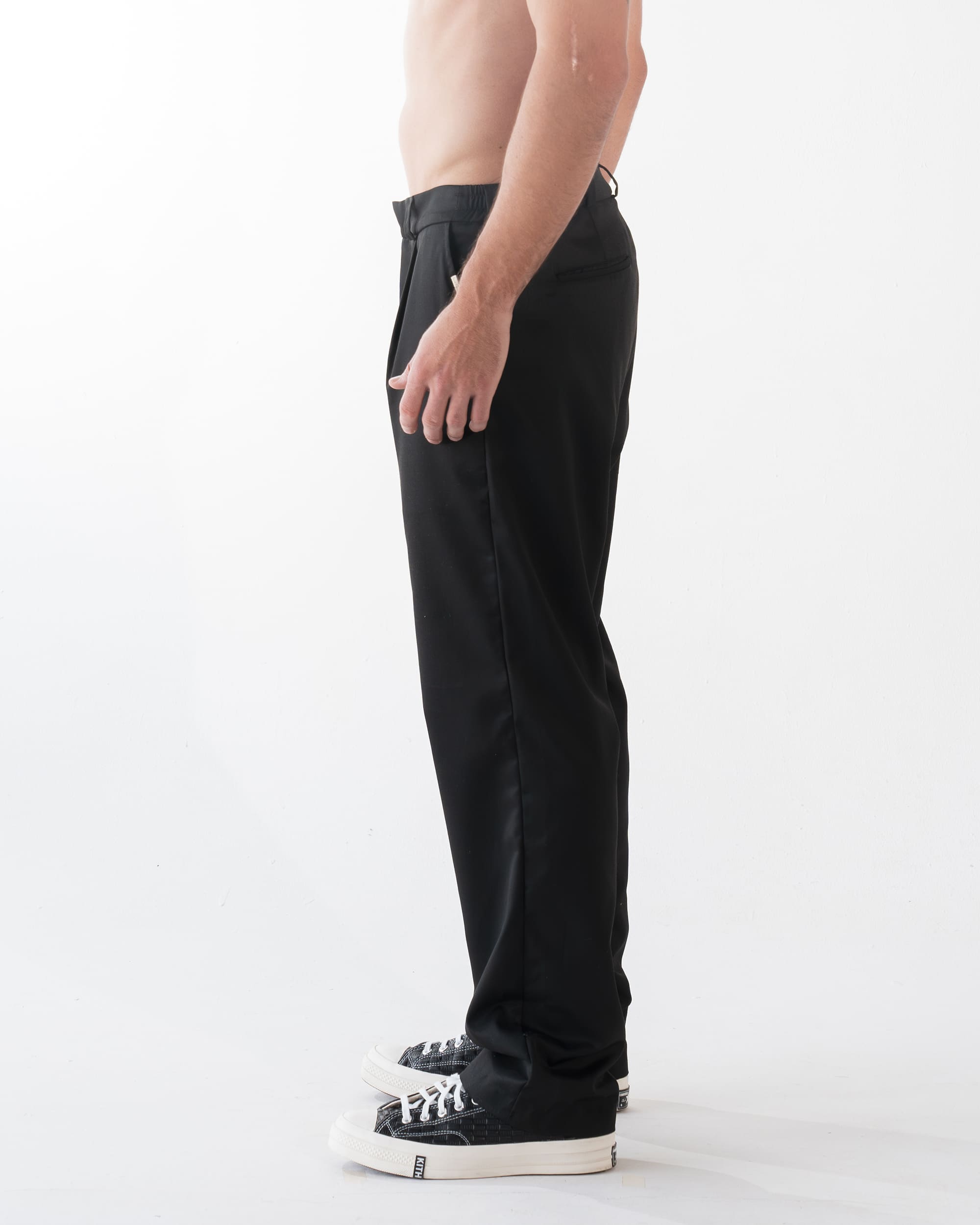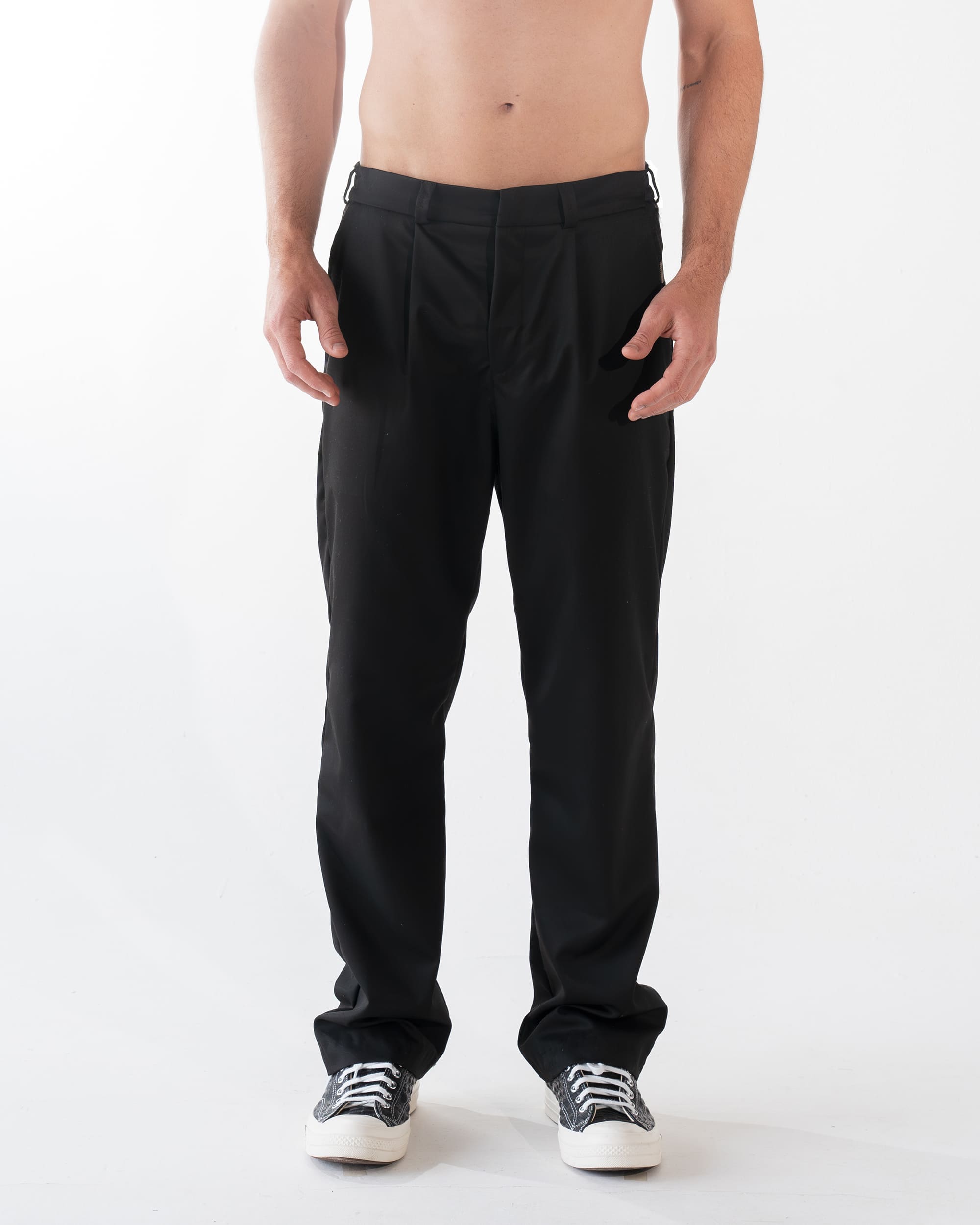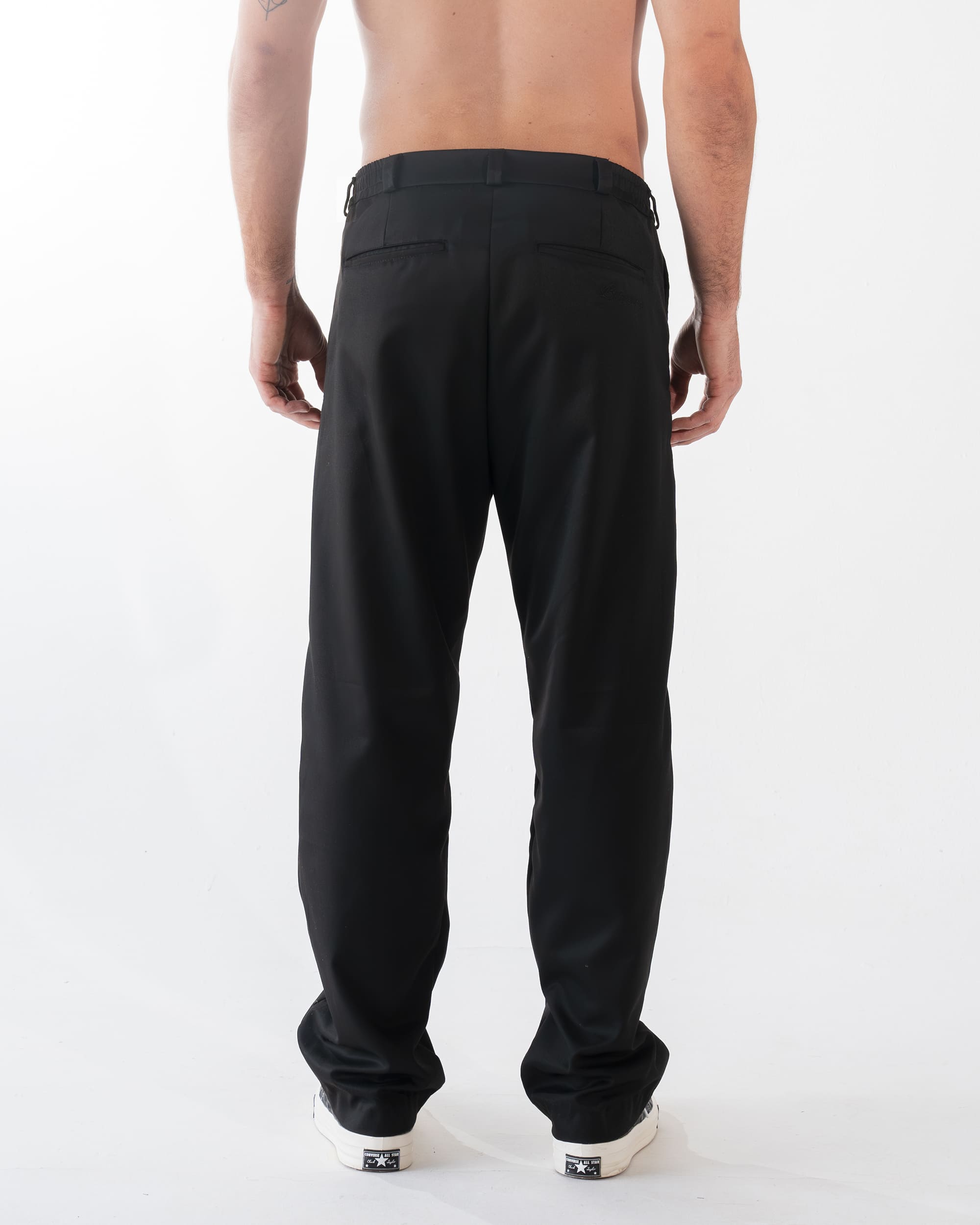 Pantalón negro en paño con detalles ajustables en costado de cintura para mayor comodidad. su modo de cierre es con broche y cremallera. Bolsillos delanteros y ribetes en posterior con bordado a todo. el modelo mide 1,86cm y usa talla M