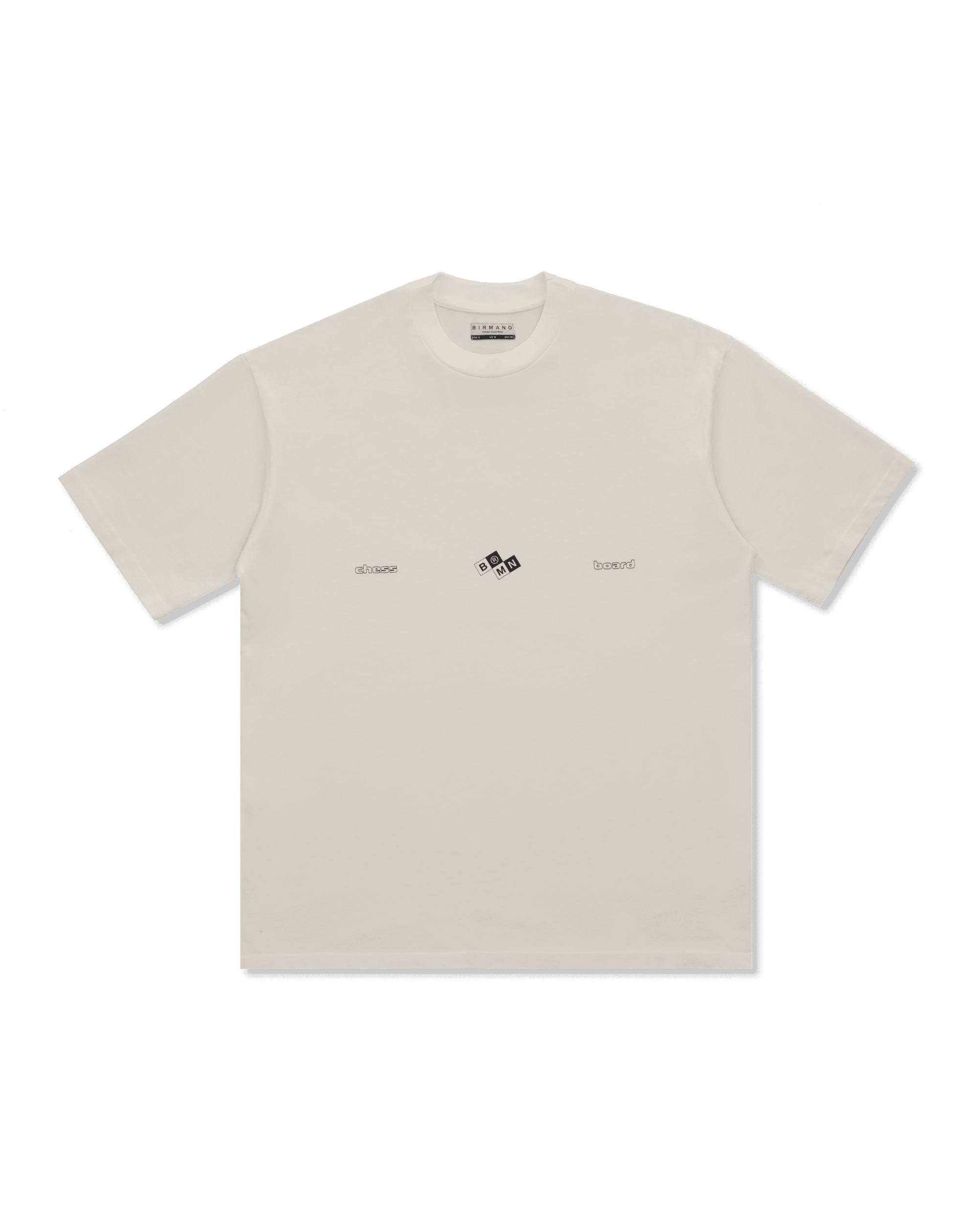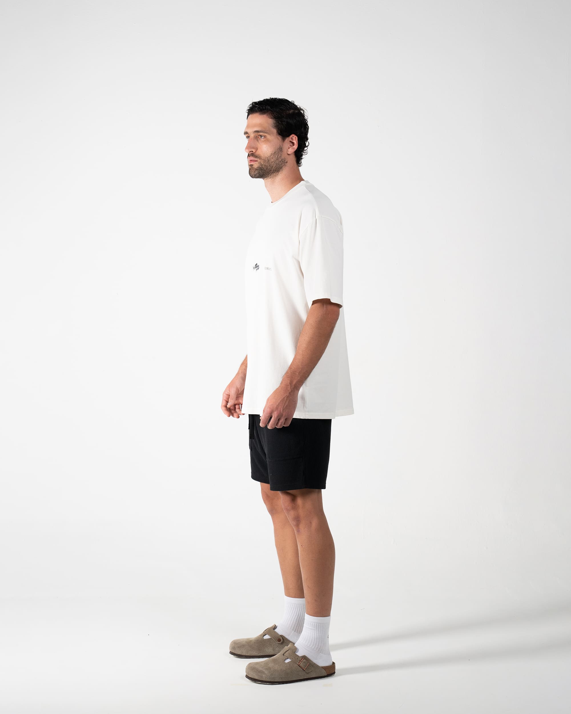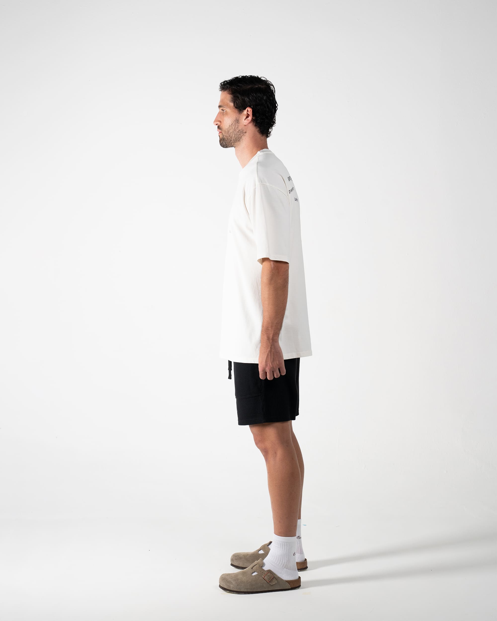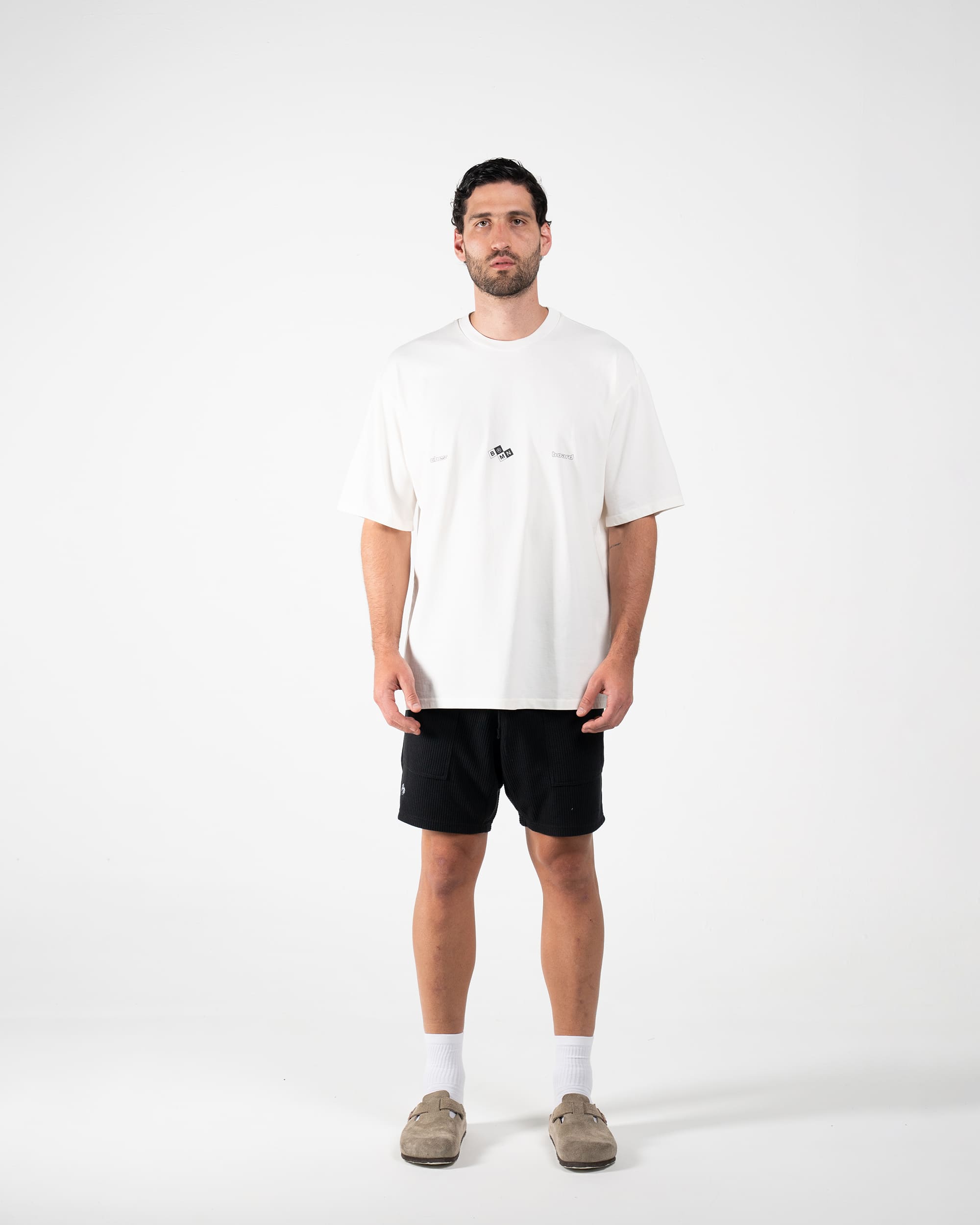 Camiseta semioversized color ivory ,100% algodón de alto gramaje (250gr) con un estampado en centro delantero y estampado en cetro espalda en color negro. Cuello en rib. El modelo mide 1,86cm y usa la talla XL