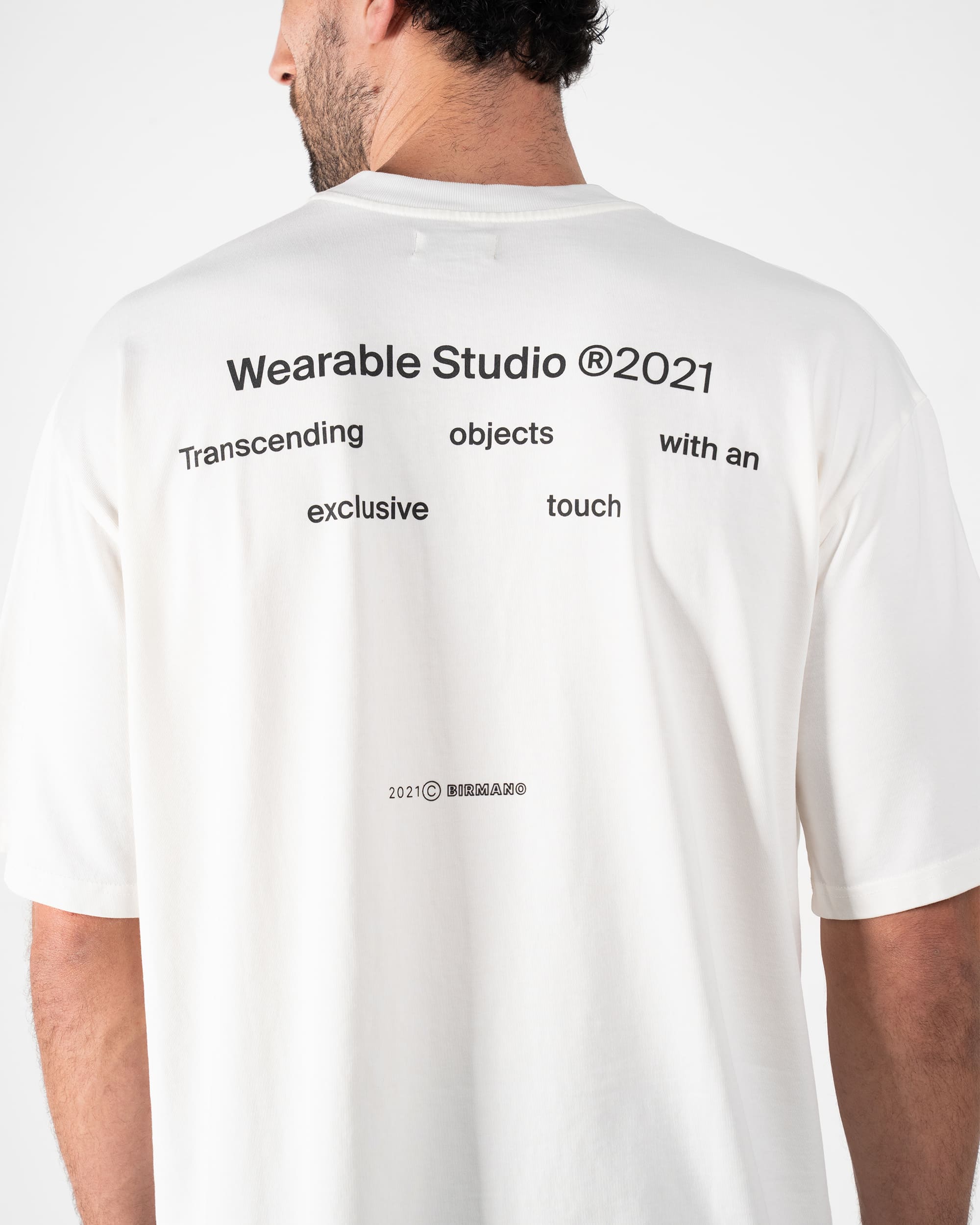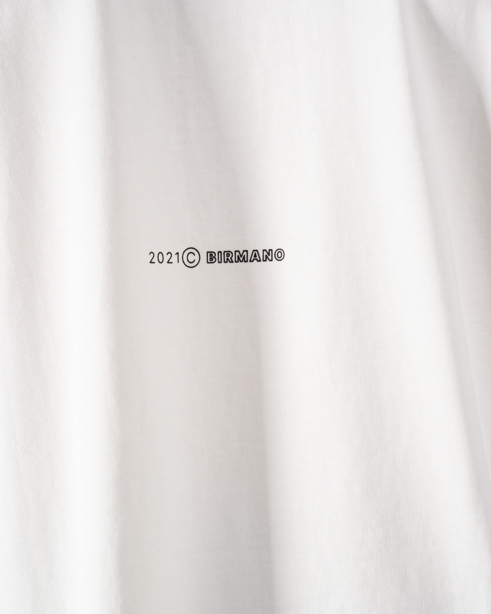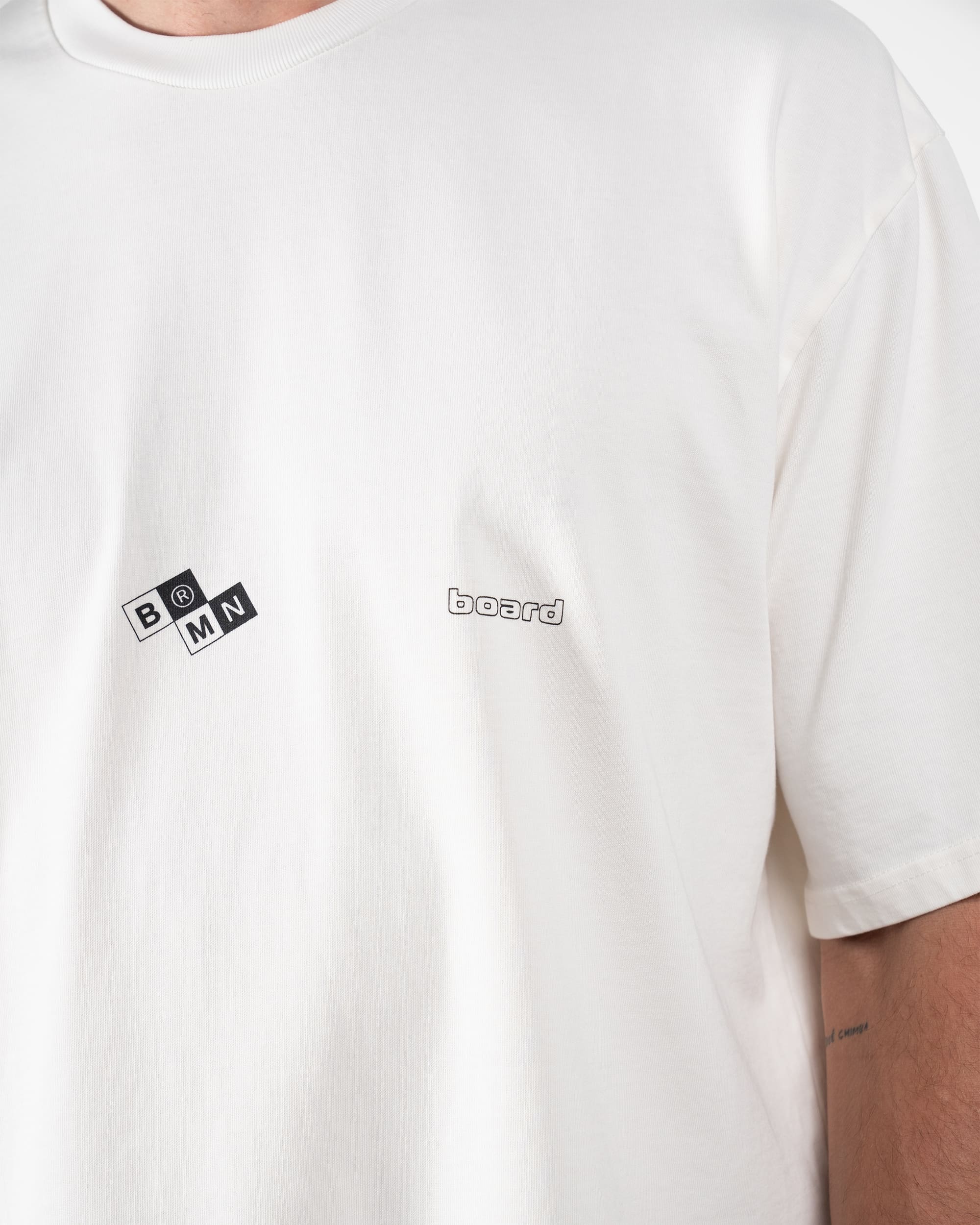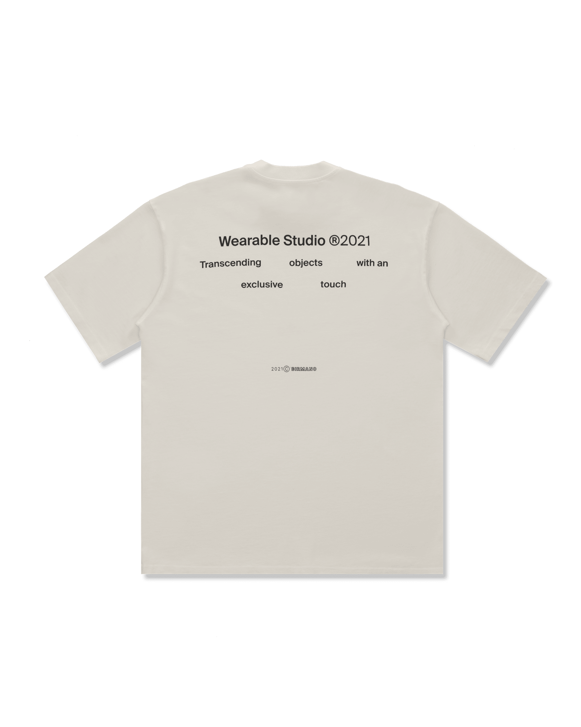 Camiseta semioversized color ivory ,100% algodón de alto gramaje (250gr) con un estampado en centro delantero y estampado en cetro espalda en color negro. Cuello en rib. El modelo mide 1,86cm y usa la talla XL