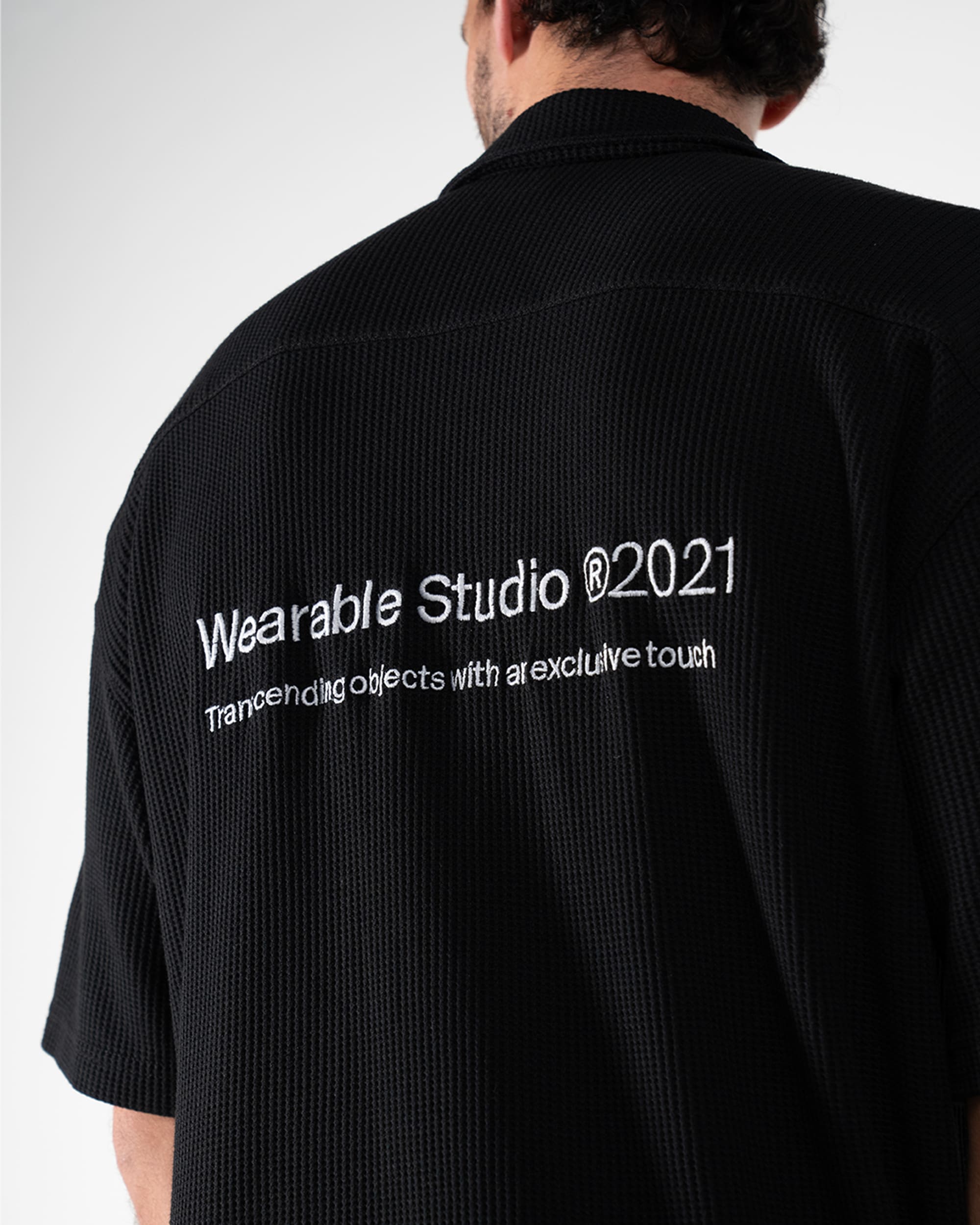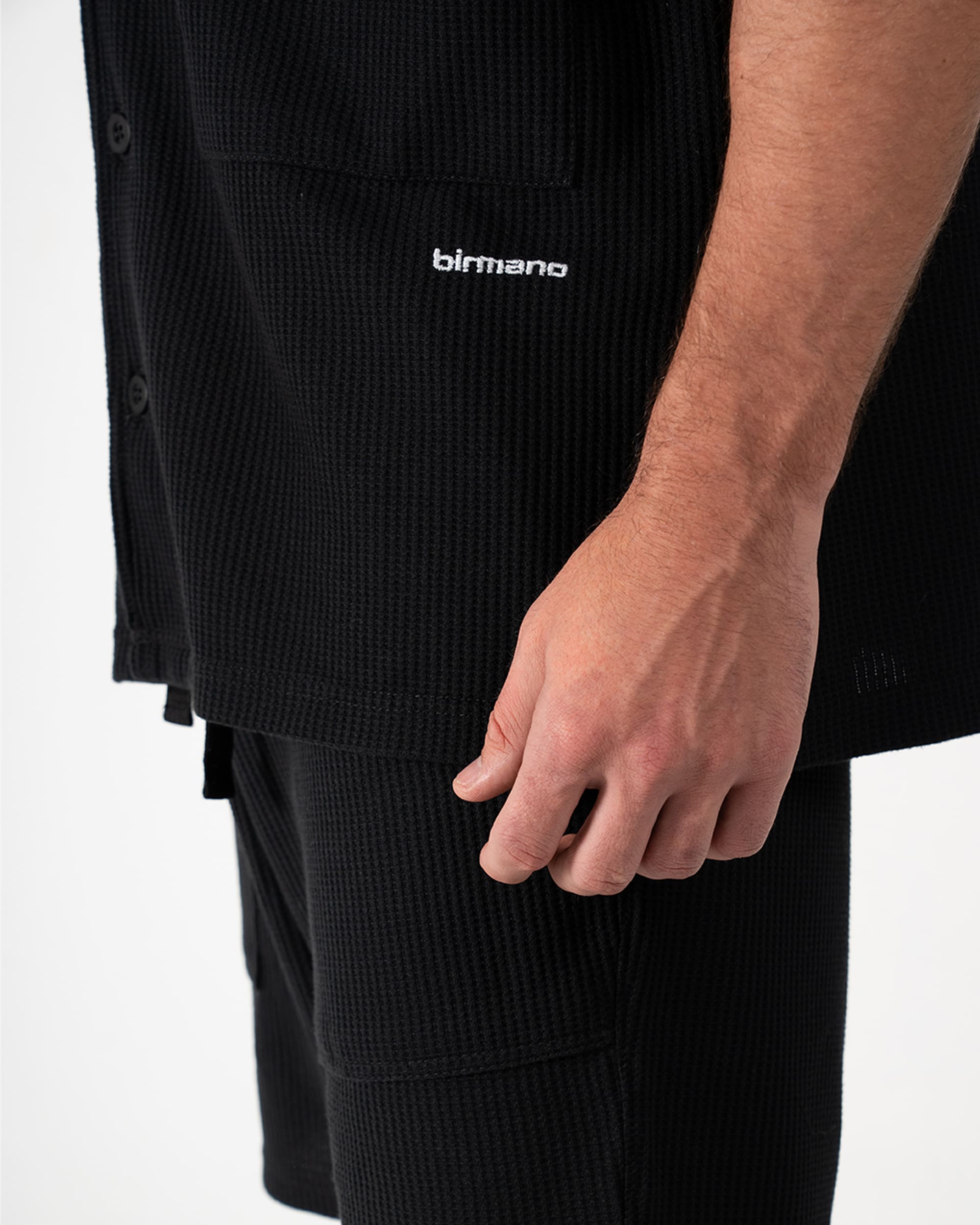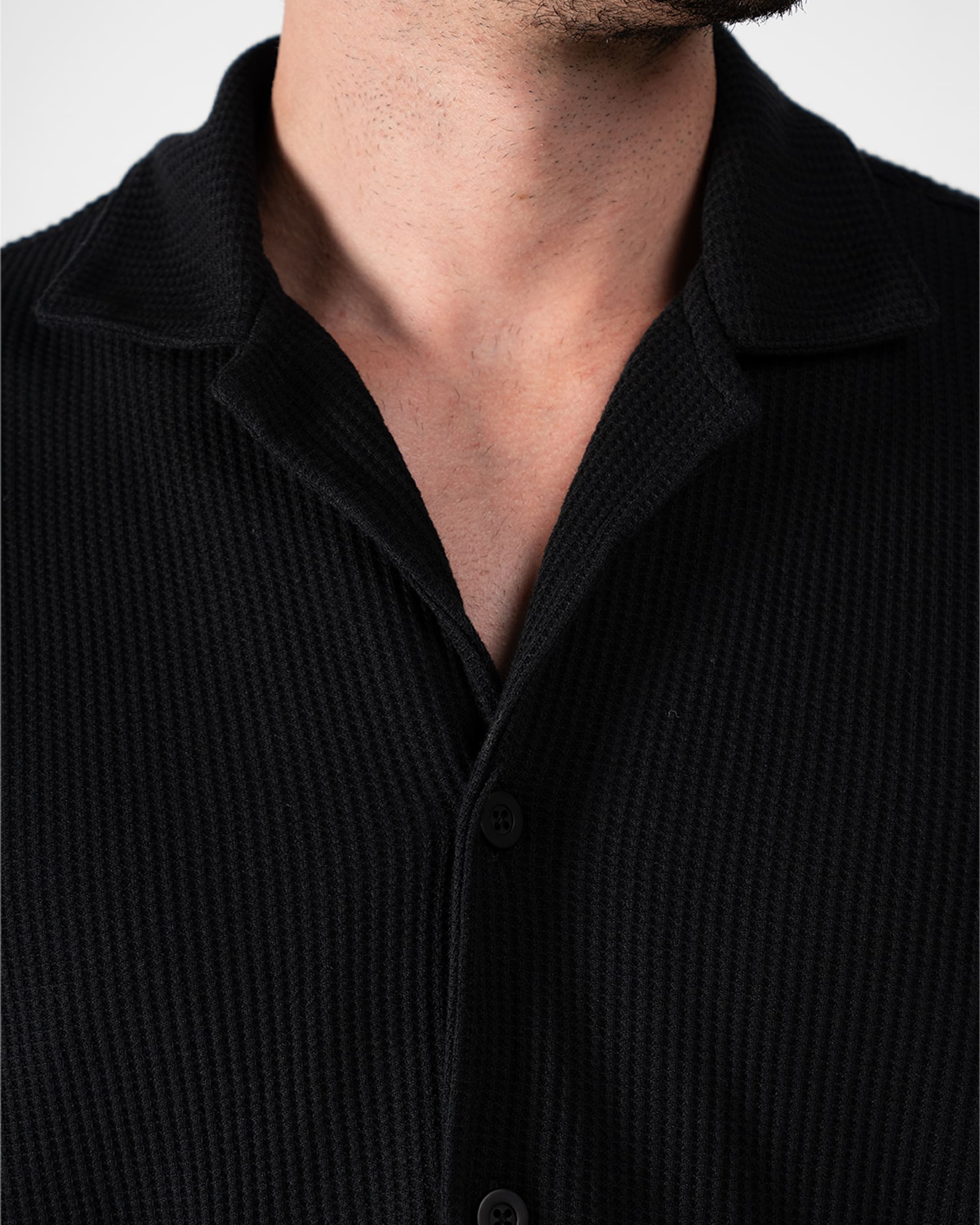 Camisa en tela texturida, con bolsillos en la parte frontal y bordado debajo de bolsillo izquierdo. El modelo mide 1,86cm y usa talla L