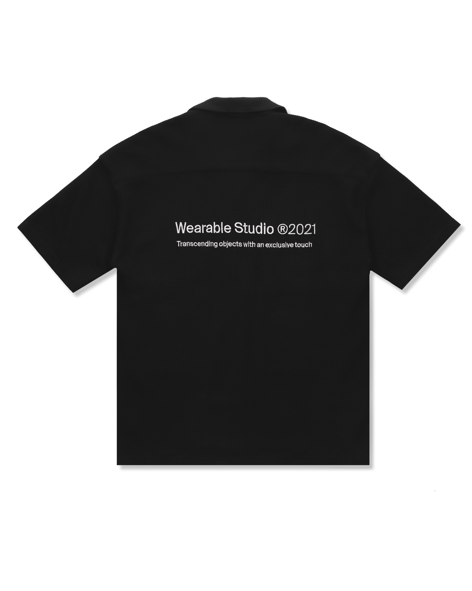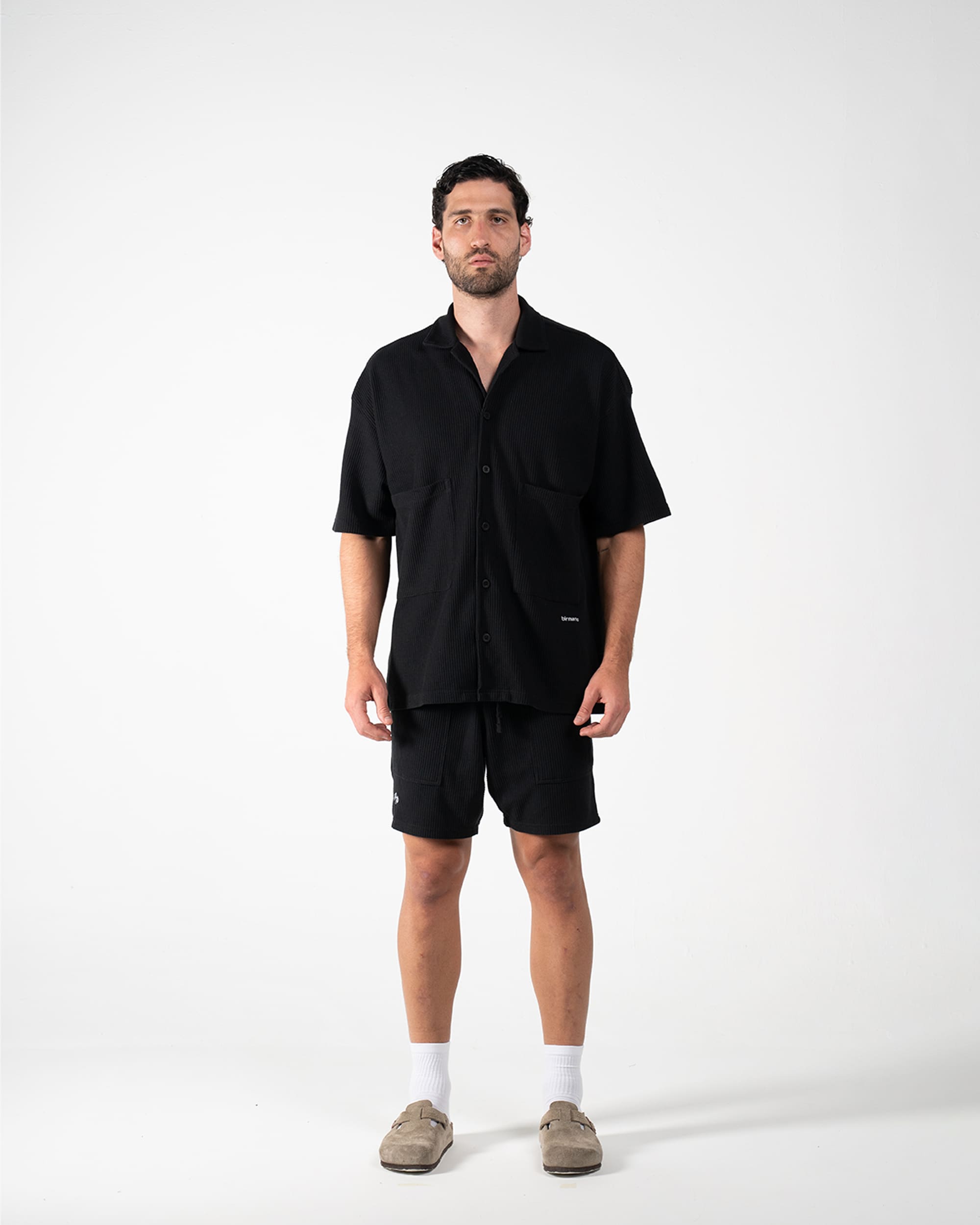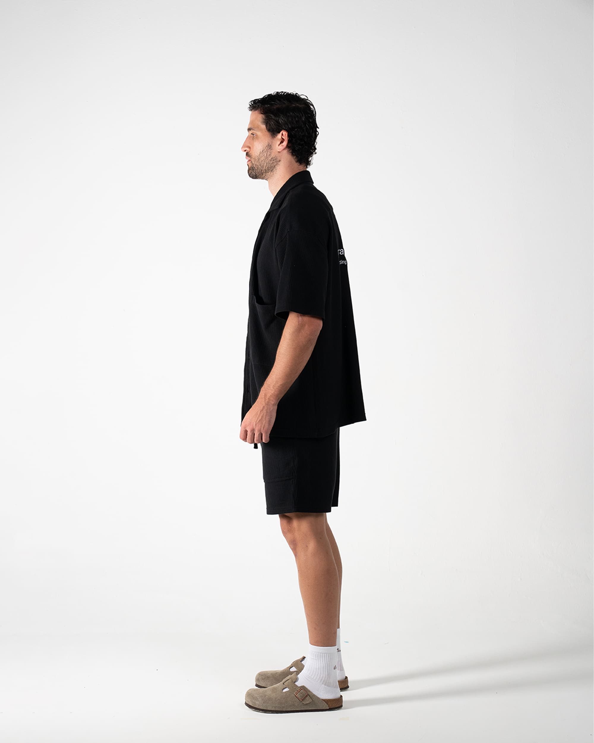 Camisa en tela texturida, con bolsillos en la parte frontal y bordado debajo de bolsillo izquierdo. El modelo mide 1,86cm y usa talla L