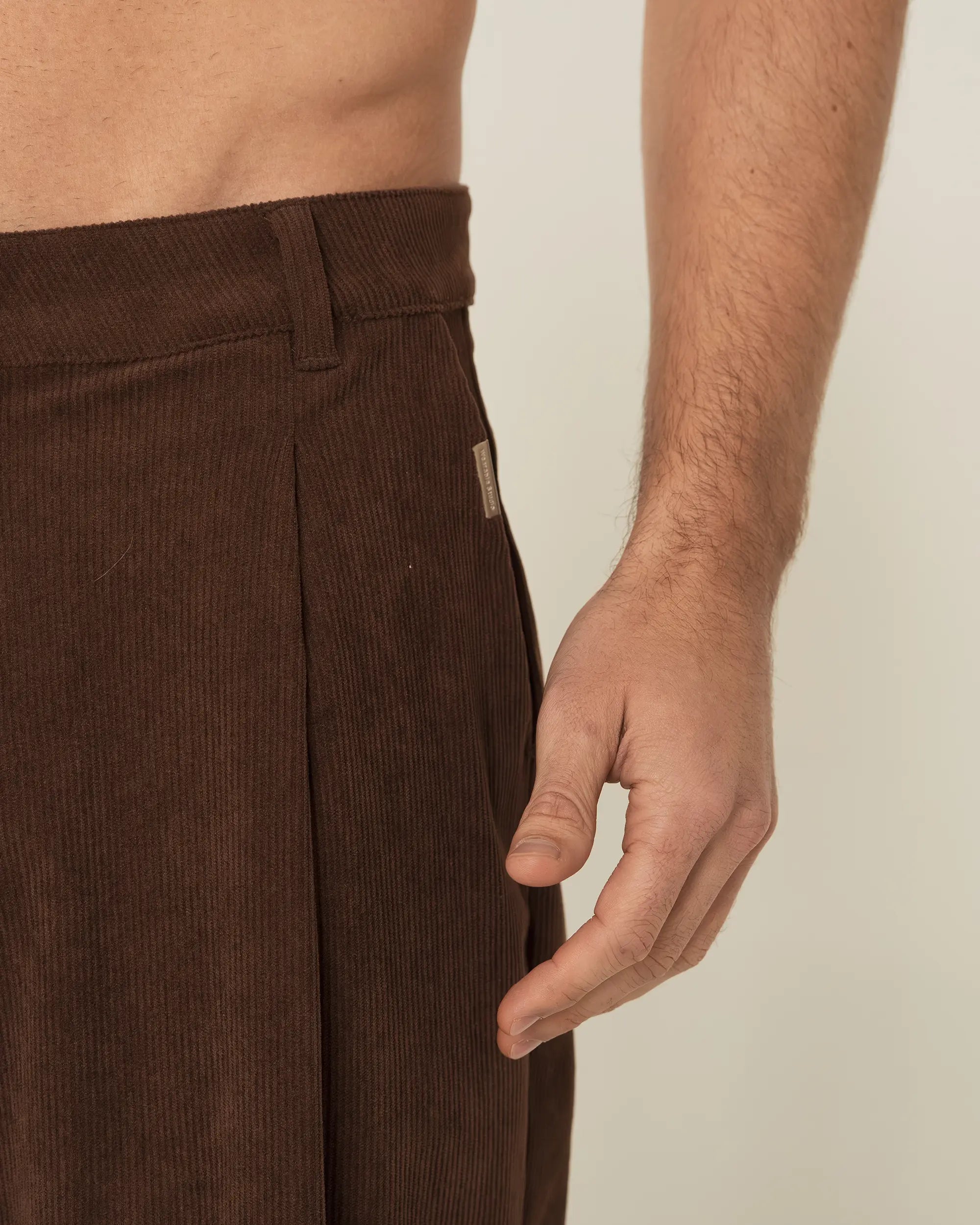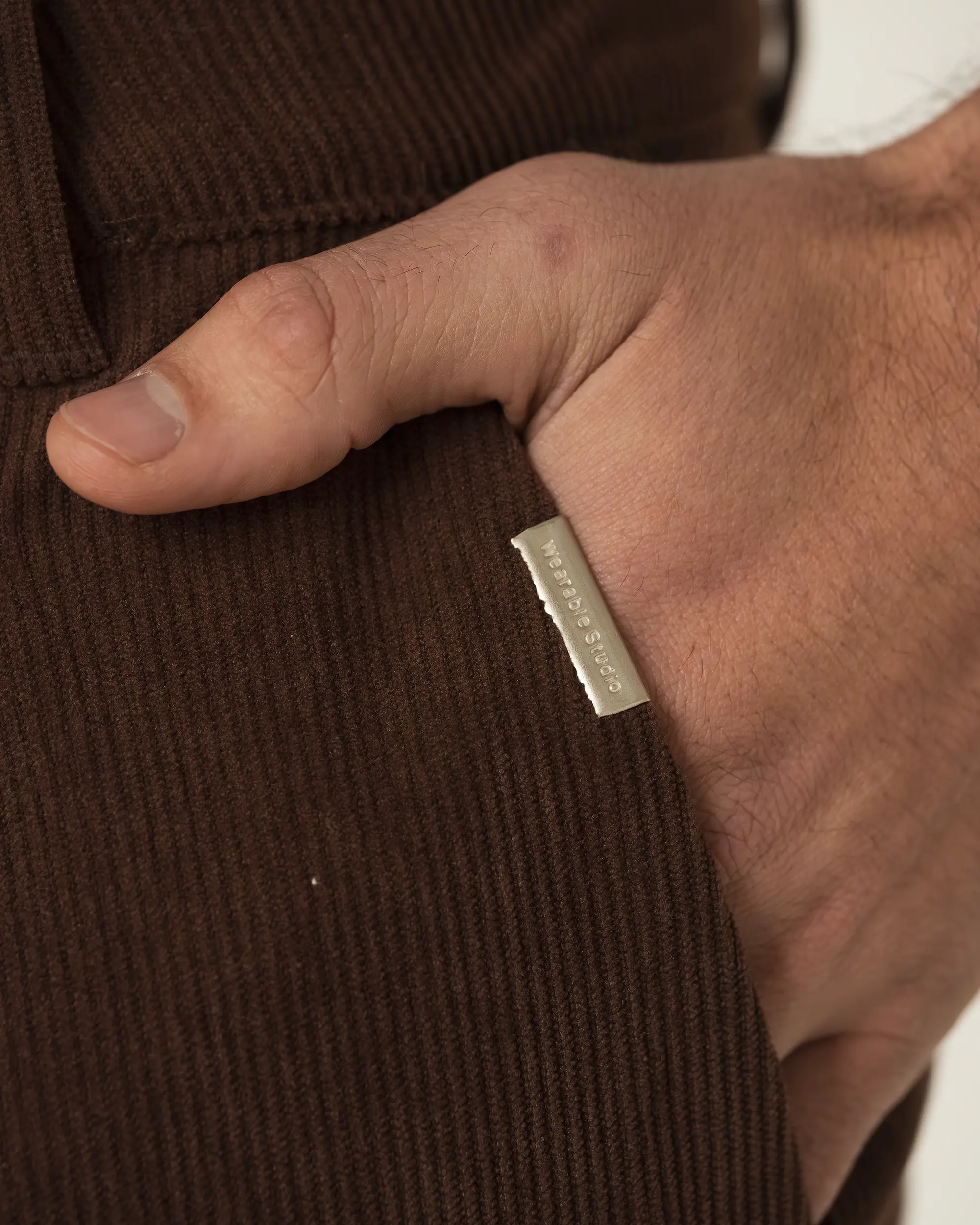 pantalón en cordoroy color beige bota recta. modo de cierre con botón y cremallera. Detalle de placa en bolsillo delantero.