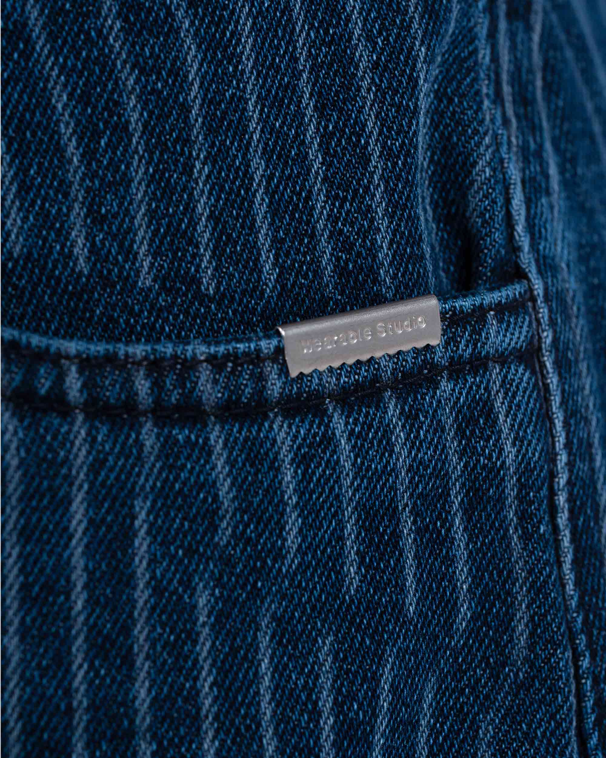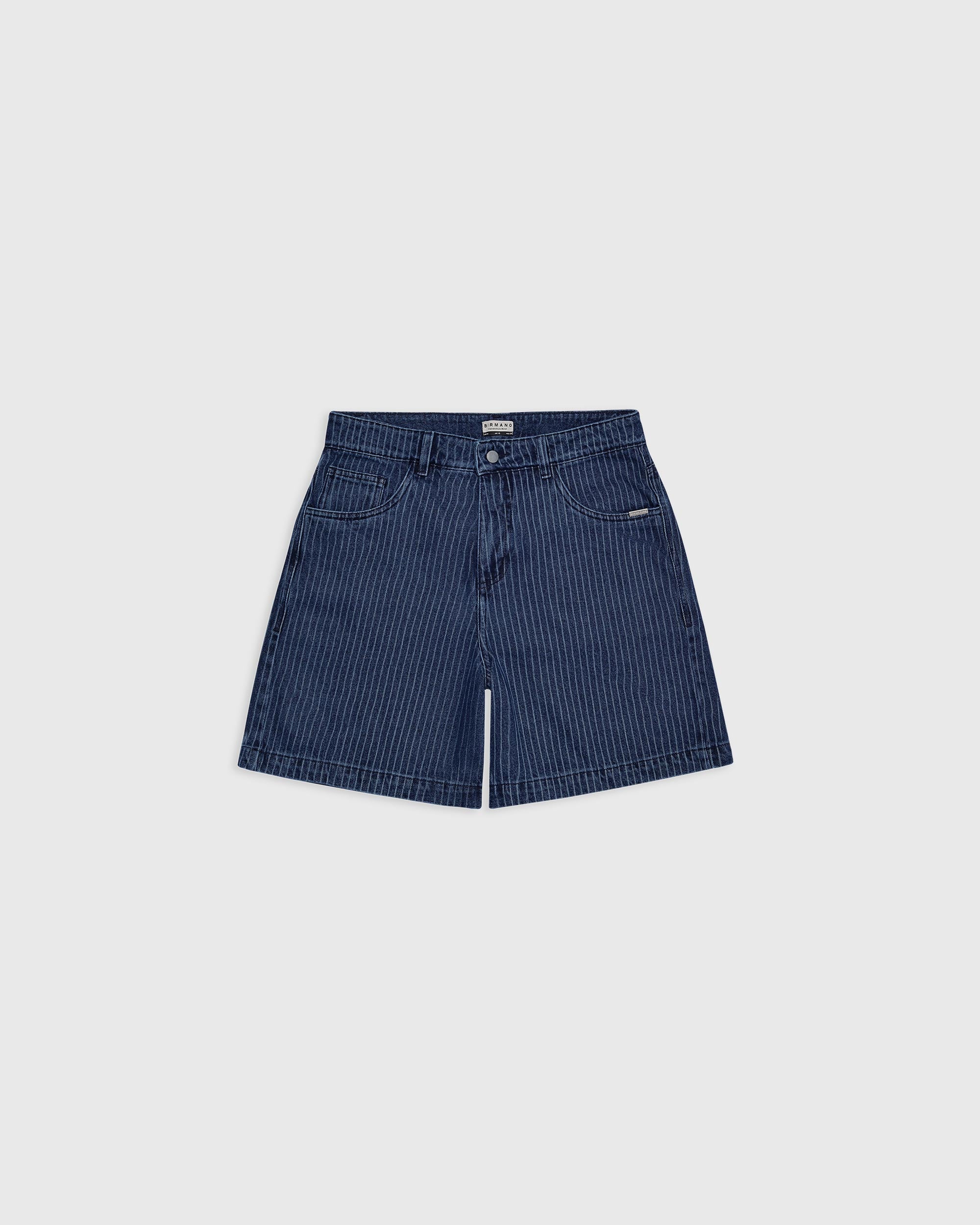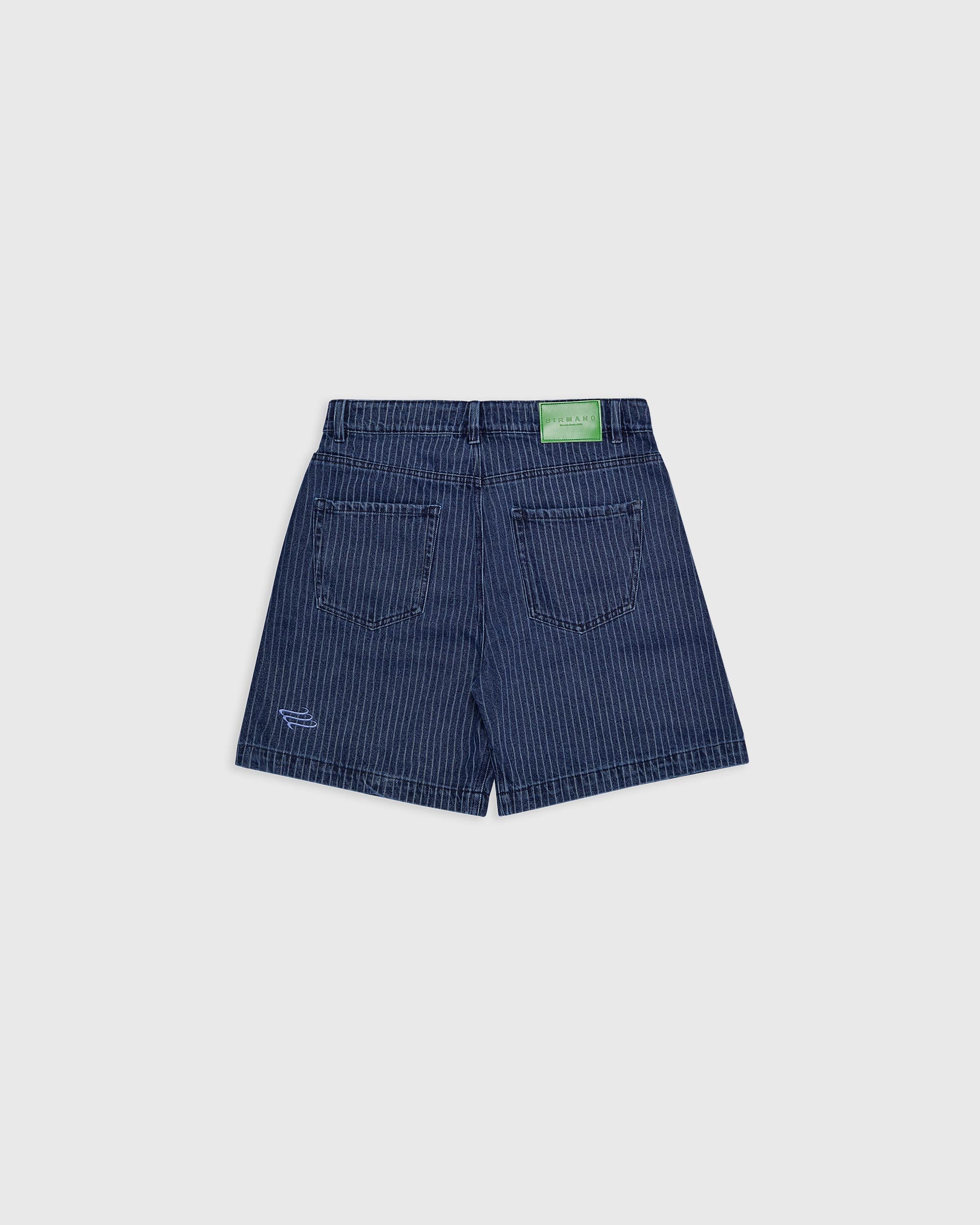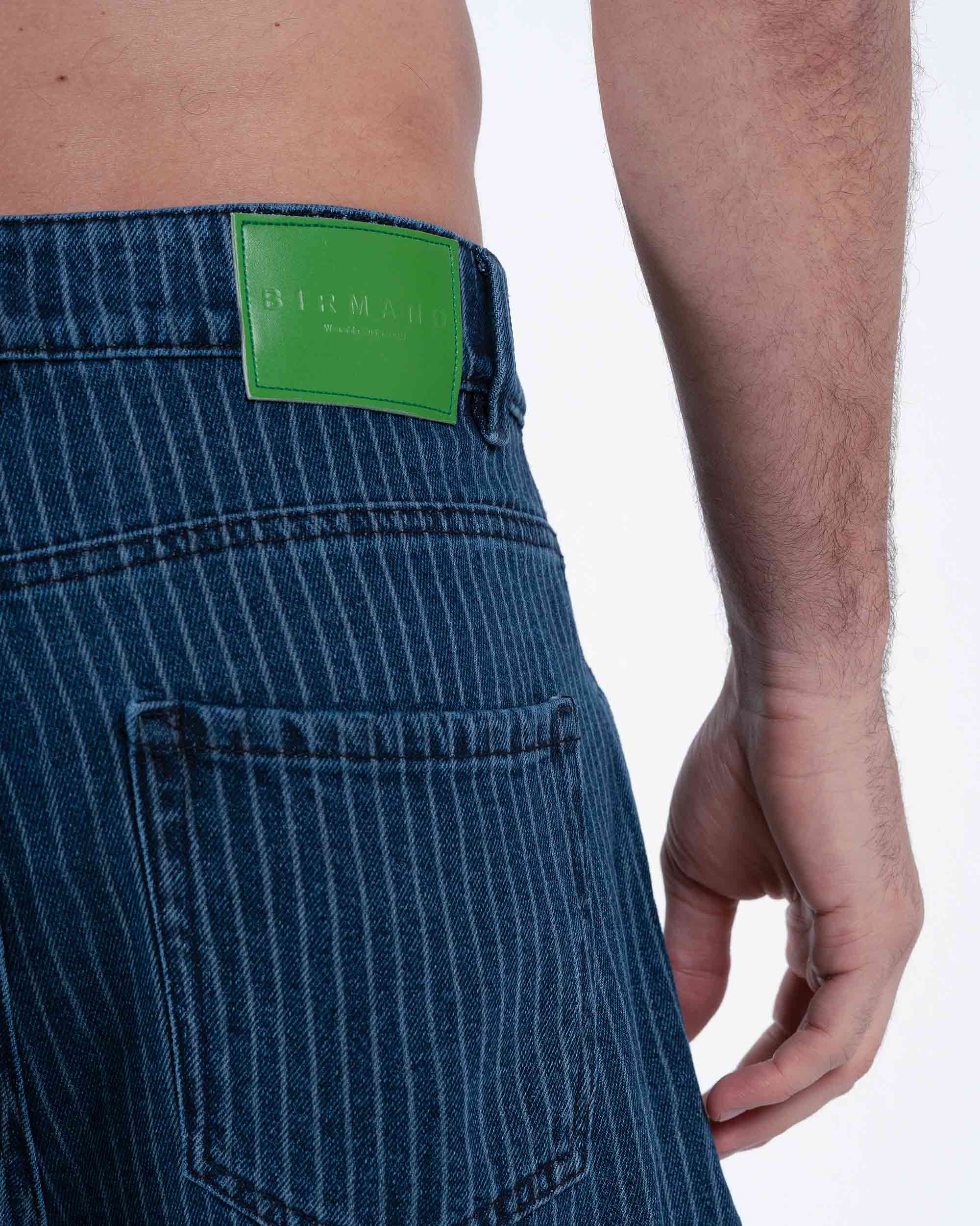 bermuda 100% algodón-denim arriba de la rodilla color azul oscuro con patrón de rayas a láser. modo de cierre con botón y cremallera. detalle de placa en bolsillo delantero y bordado a tono en la bota posterior izquierda.