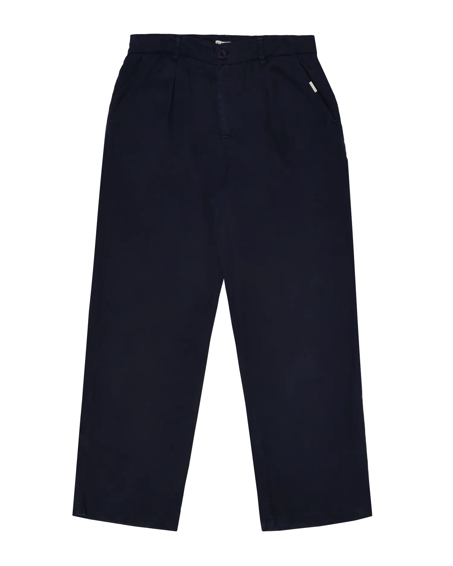 Pantalón 100% algodón fluido color Azul Oscuro bota recta. Modo de cierre con Botón y cremallera. Detalle de placa en bolsillo delantero.