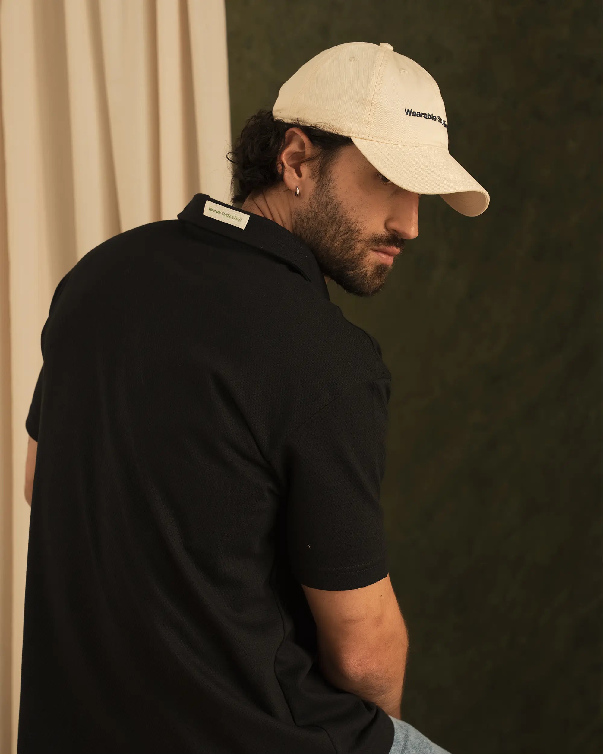 camisa fit semioversized negra, 100% algodón de alto gramaje con detalle bordado a tono en el delantero a la altura del codo y detalle de marquilla en cuello posterior.