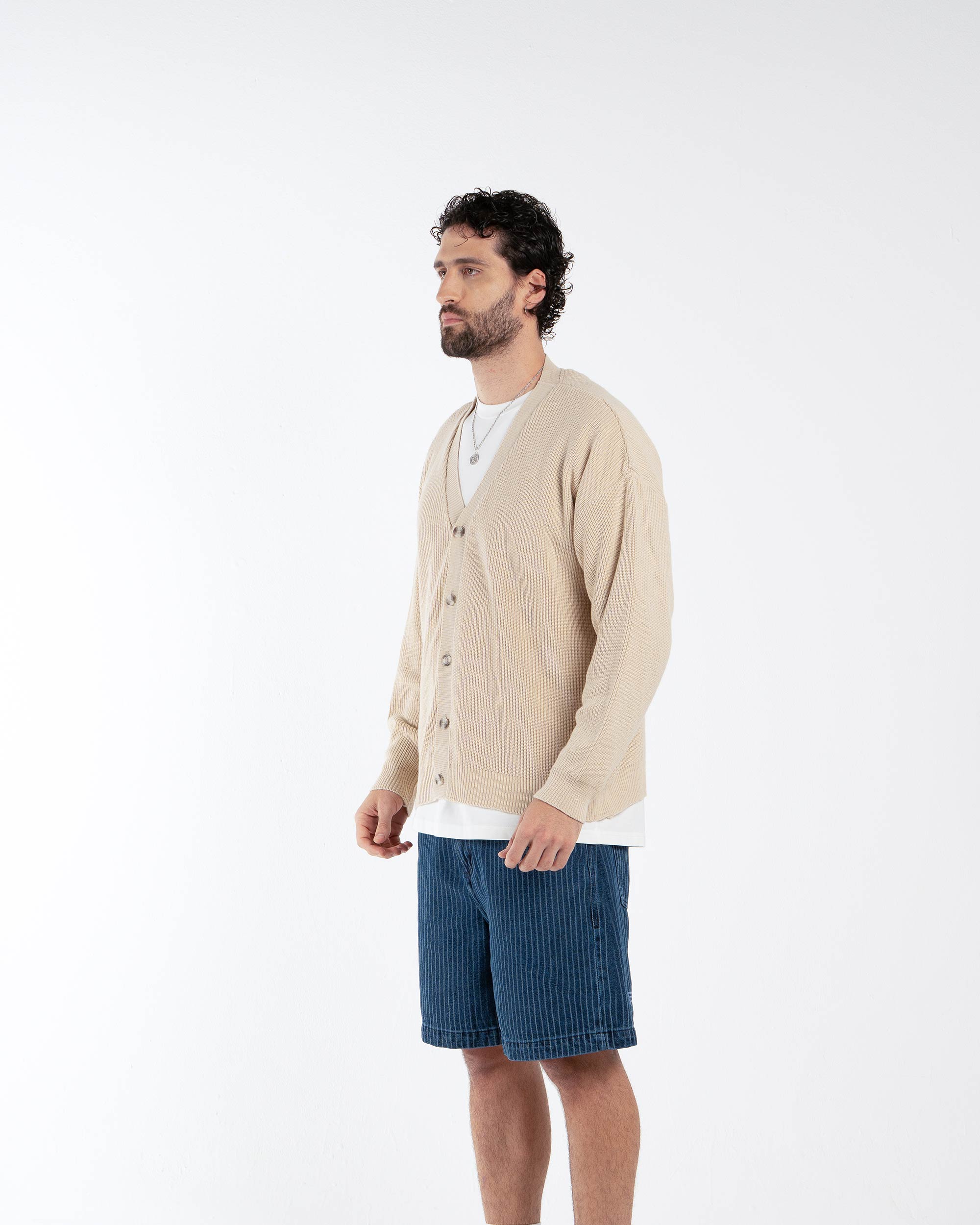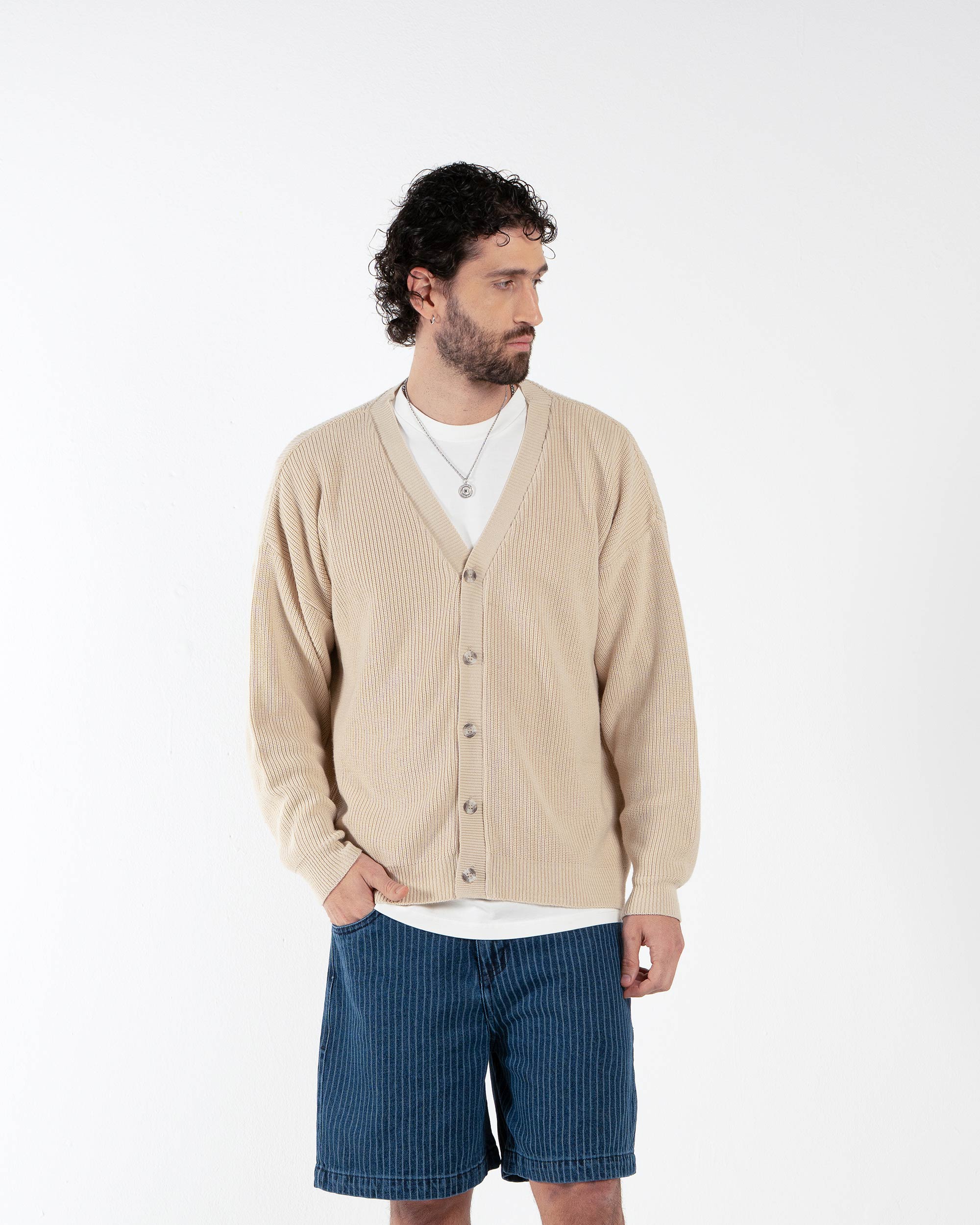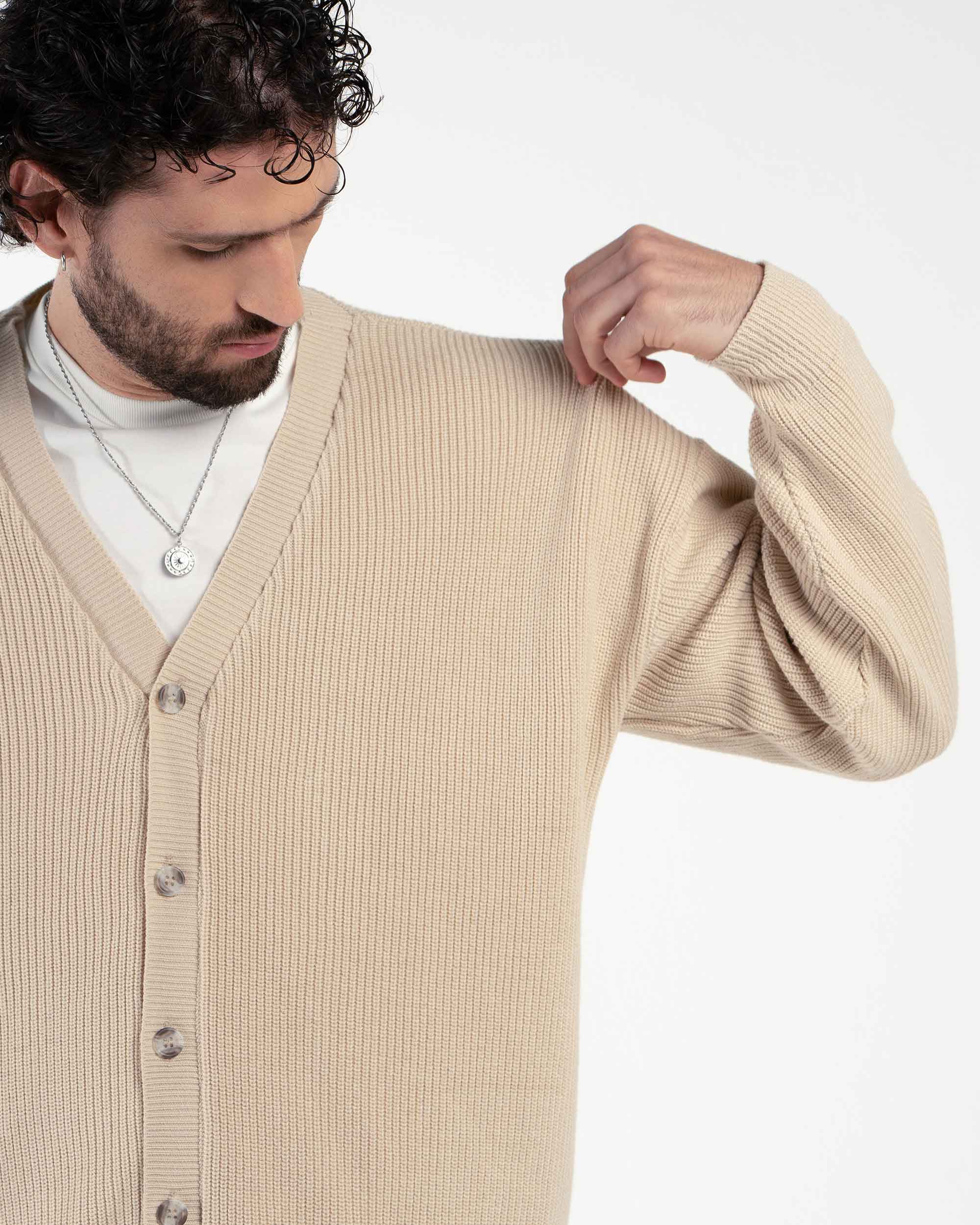 cárdigan semioversized color beige.100% acrílico, tacto algodón. detalle de marquilla expuesta en cuello posterior.
