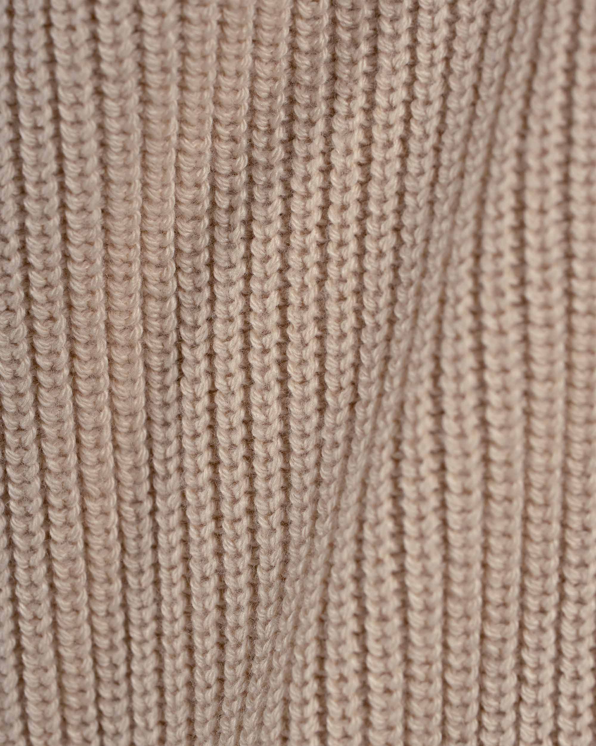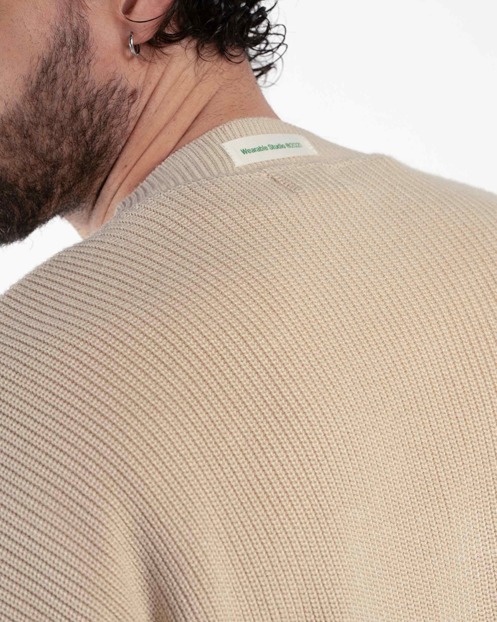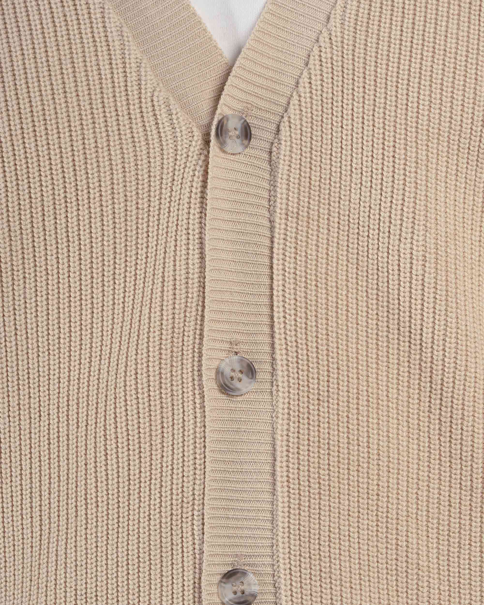 cárdigan semioversized color beige.100% acrílico, tacto algodón. detalle de marquilla expuesta en cuello posterior.