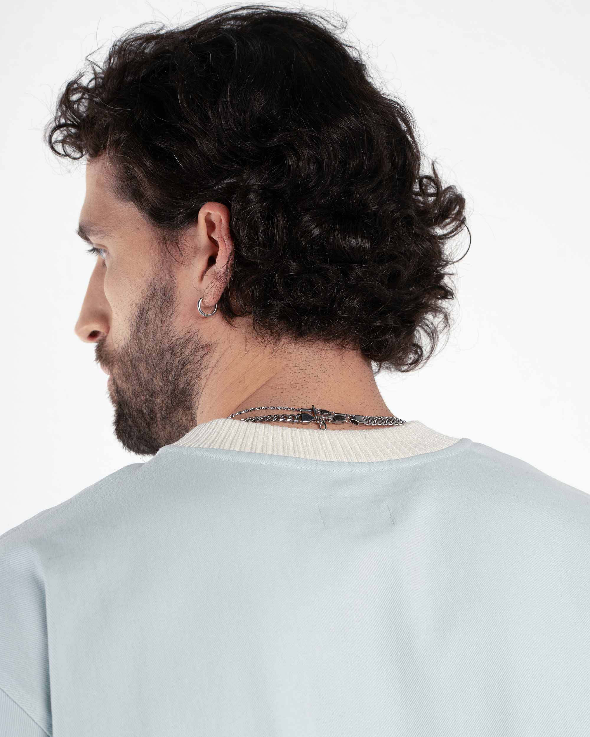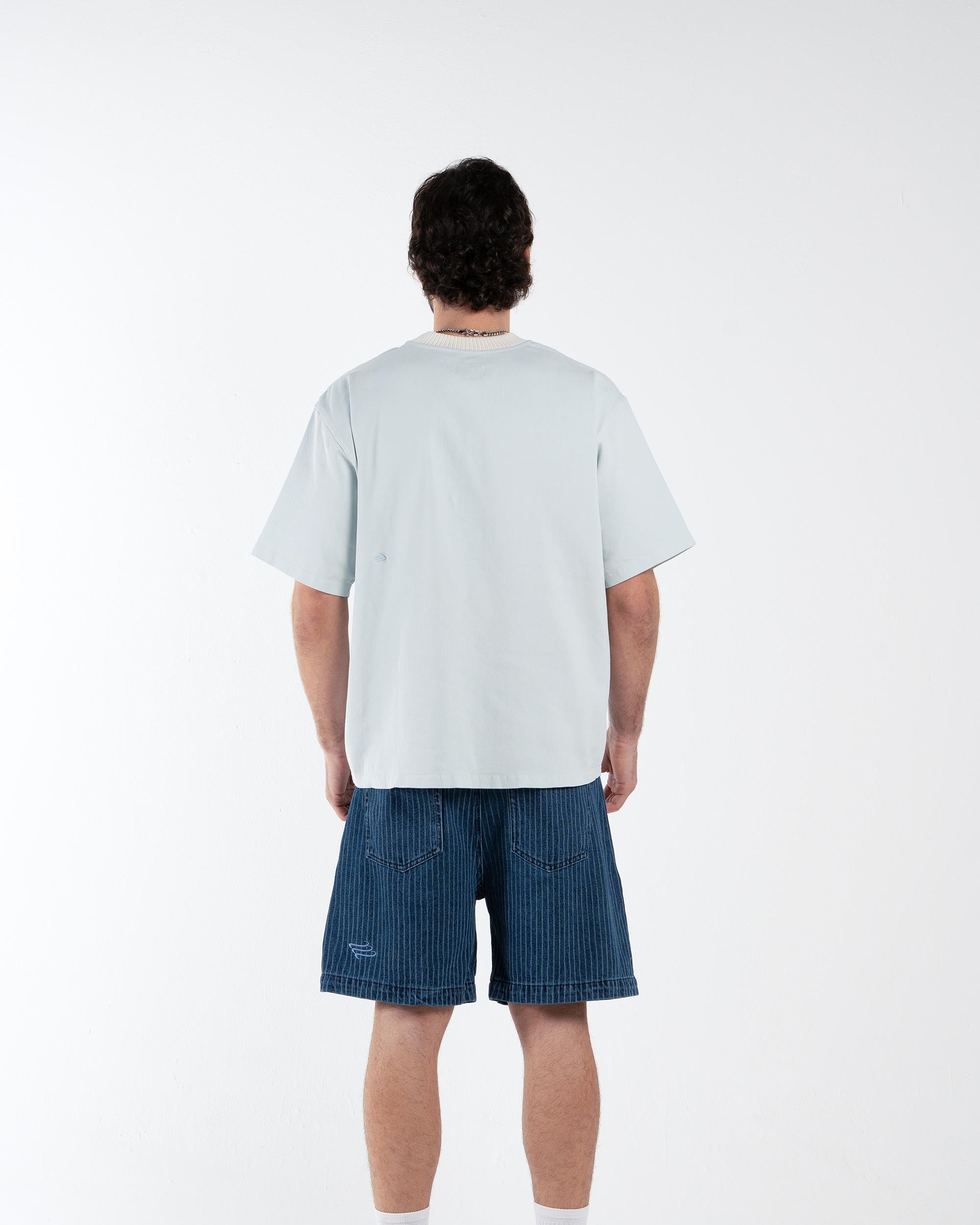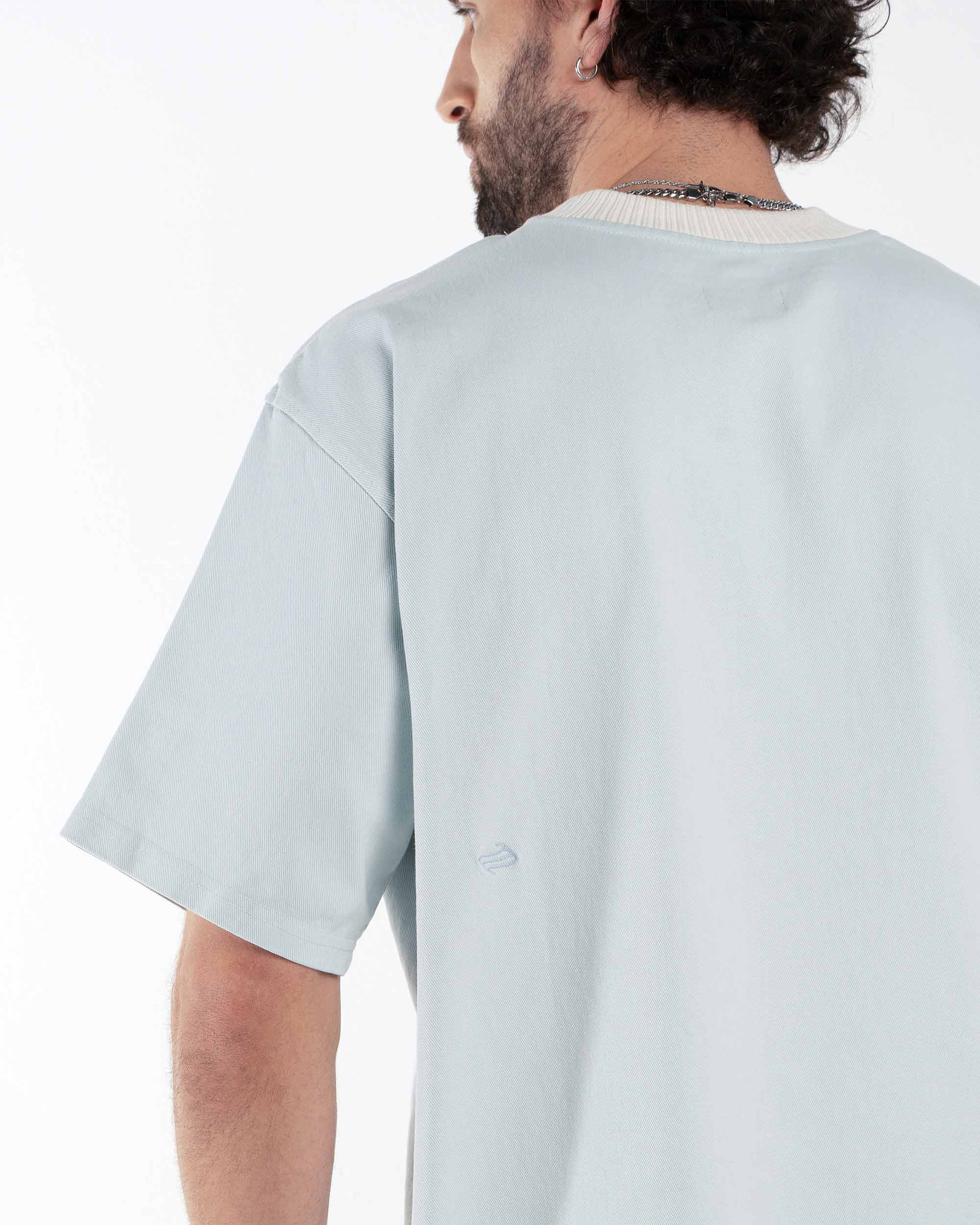 camiseta semioversized color azul hielo. drill tacto denim 100% algodón. estampado a tono en espalda y cuello tejido color ivory.