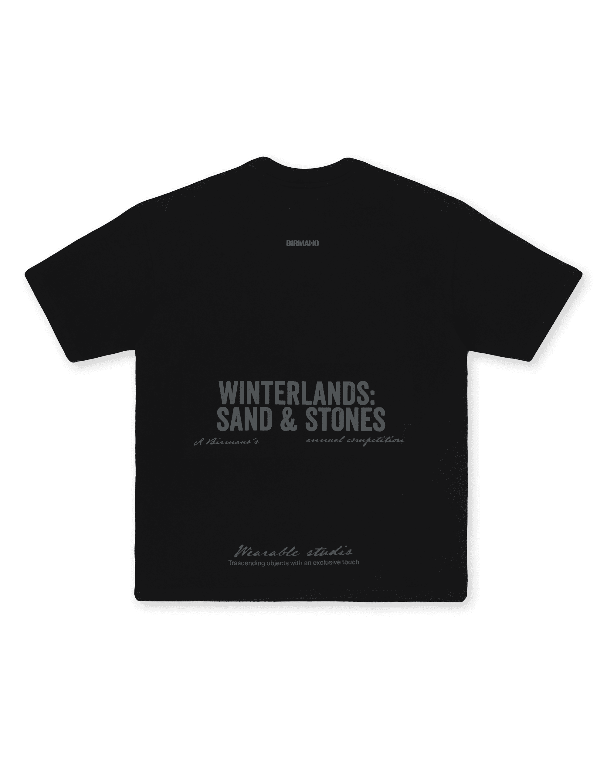 Camiseta semioversized color negro ,100% algodón de alto gramaje (250gr) con estampado delantero a la altura del codo n y estampado en espalda en color gris. Cuello en rib. El modelo mide 1,86cm y usa la talla XL
